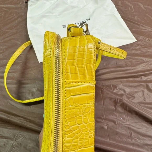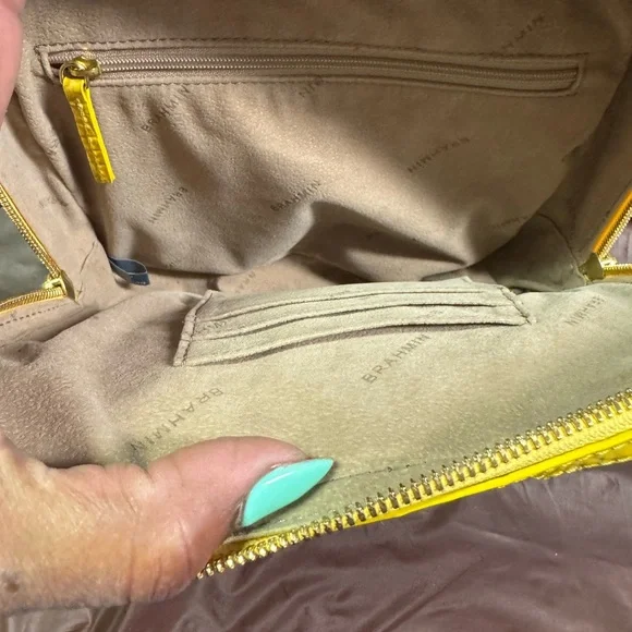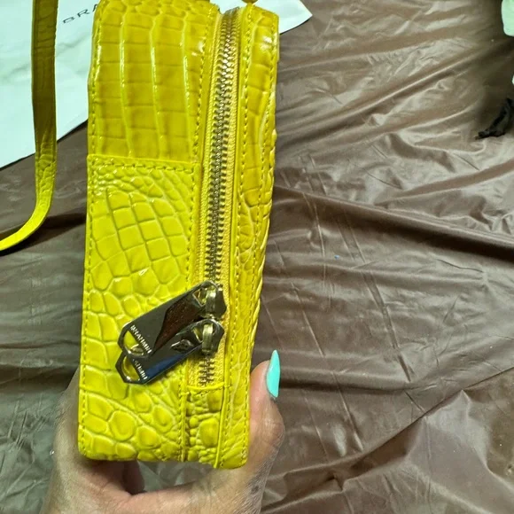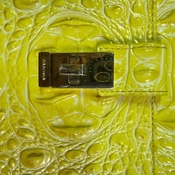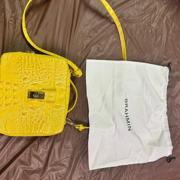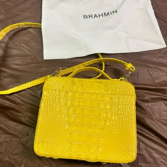 This vibrant yellow mini bag from Brahmin features a luxurious crocodile embossed texture, offering a striking and sophisticated look. Its compact size and structured design make it a perfect accessory for any occasion, adding a touch of elegance to your ensemble. This sunflower Brahmin Evie comes with duster bag. Gently used condition.