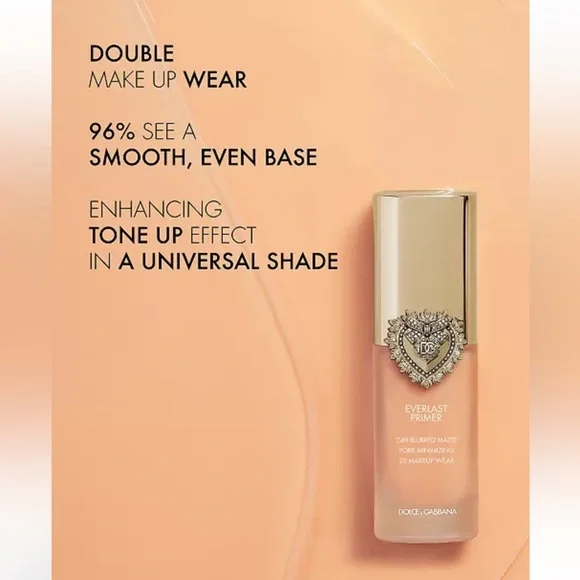 Everlast Primer instantly minimizes pores and perfects the skin with immediate and 24-hour blurring and mattifying results. Its spectacular formula controls shine for a soft matte effect that lasts all day, while also enhancing the skin tone with a tone-up effect that is suitable for all skin tones. Prep your skin with everlasting confidence before makeup application. Everlast Primer comes in a beautiful glass bottle with a gold-tone cap sealed by the iconic DOLCE&GABBANA Sacred Heart.Product FeaturesWHAT IT IS:A translucent pore-minimizing primerWHAT IT DOES:Provides shine control and a blurring effect while staying comfortable throughout wearINGREDIENT HIGHLIGHTS:Niacinamide helps reduce shine and minimize pore appearance; collagen helps improve the skin barrier and retain moistureHOW TO USE:For the ultimate flawless complexion, apply the primer with the fingertips to blur and minimize pore appearanceFollow with Everlast Foundation (sold separately) to perfect the skin with a full-coverage matte finish that stays impeccable all dayRESULTS:24-hour blurred matte finish*2x makeup wear**Non-comedogenic**100% agree it improves makeup grip***96% agree it creates a smooth, even base***90% agree it has a tone-up effect on the skin tone***100% agree it has comfortable all-day wear****Based on clinical tests**Based on clinical tests in combination with a DOLCE&GABBANA foundation***Based on self-evaluation testsThe Everlast Primer has a number of 30 participants