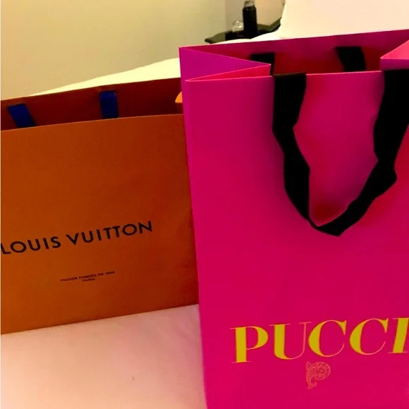 Brand new beautiful authentic midiumSize Emilio Pucci 🛍️ shopping rare bag with strong fabric handles. I bought in Italy with extra expensive Pucci items. Only few stores left in the World of these, so every Pucci item soon gonna be super rare , a specially shopping bags and dust bags.I have other few items for sale from Pucci in my diva closet . They don’t make pink ones anymore. Please share and reshare this rare authentic bad on your wall and with friends . All sales are final, no return or refunds. Enjoy!