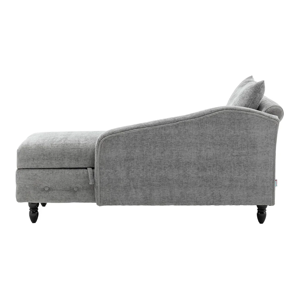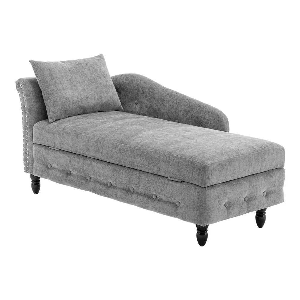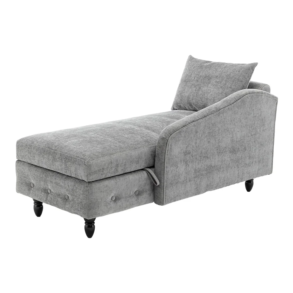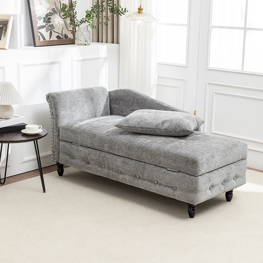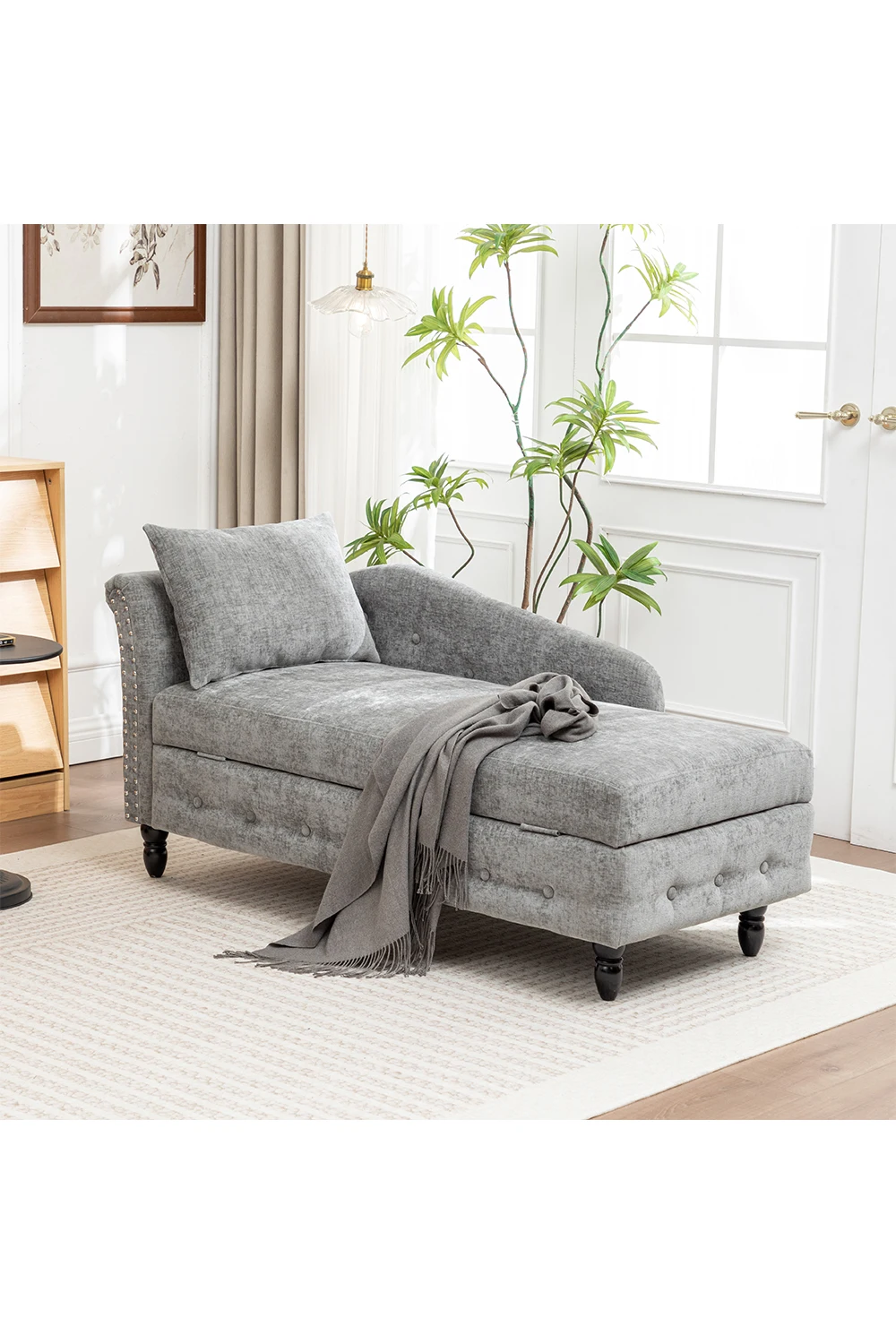 Lean back and unwind—your ideal lounge spot starts here. Upholstered in soft chenille and filled with high-resilience sponges, this chaise lounge offers lasting comfort and support. It exudes luxury and elegance with its rolled armrests and elegantly sloped back for a relaxed yet refined look. A matching pillow enhances relaxation by supporting your lumbar, while a flip-top compartment keeps essentials like magazines and blankets neatly stored. Built on a sturdy frame for durability and stability, this elegant piece blends style and function—perfect for any modern living space.
