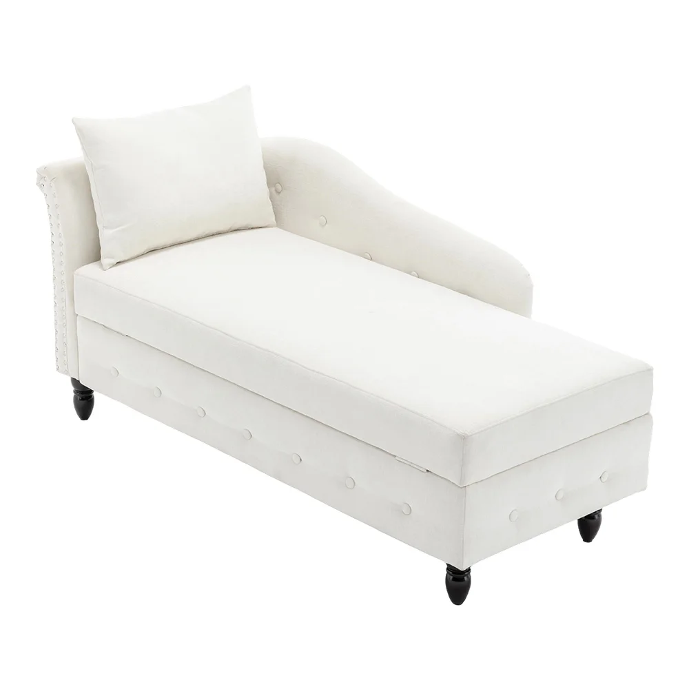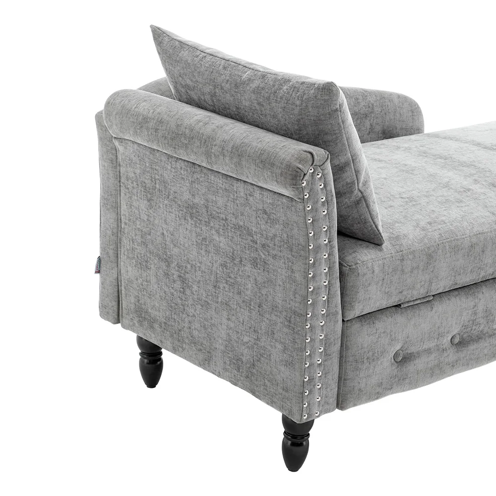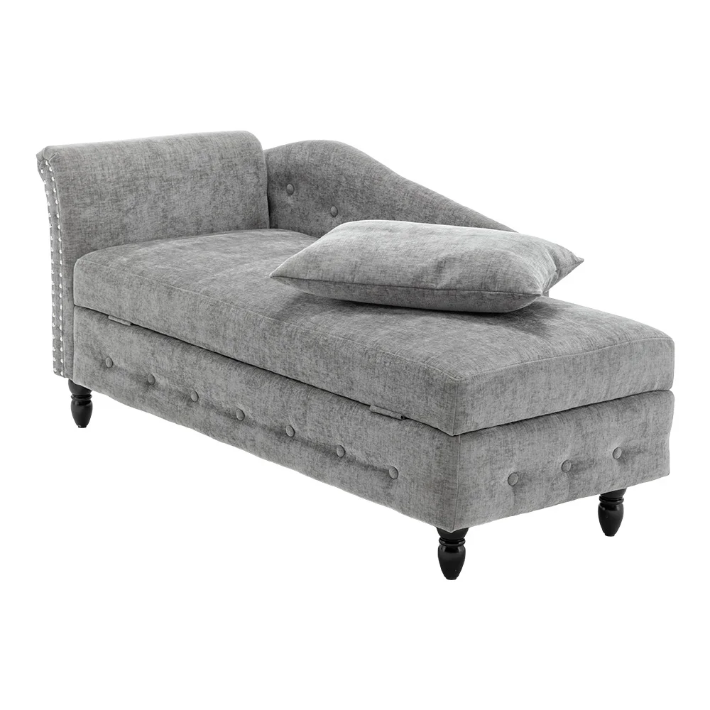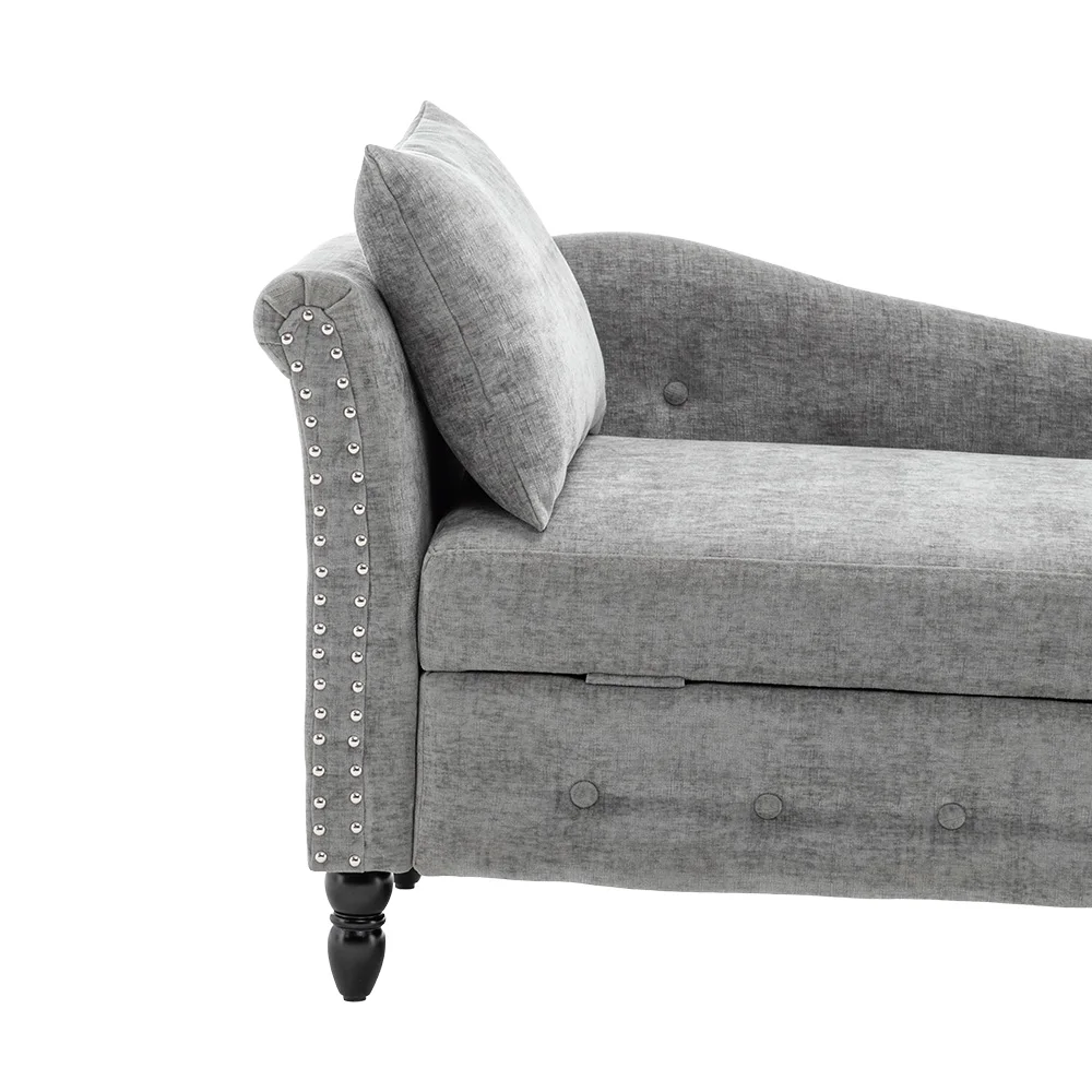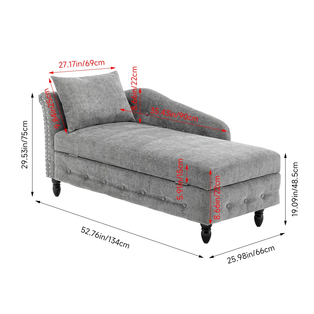 Lean back and unwind—your ideal lounge spot starts here. Upholstered in soft chenille and filled with high-resilience sponges, this chaise lounge offers lasting comfort and support. It exudes luxury and elegance with its rolled armrests and elegantly sloped back for a relaxed yet refined look. A matching pillow enhances relaxation by supporting your lumbar, while a flip-top compartment keeps essentials like magazines and blankets neatly stored. Built on a sturdy frame for durability and stability, this elegant piece blends style and function—perfect for any modern living space.