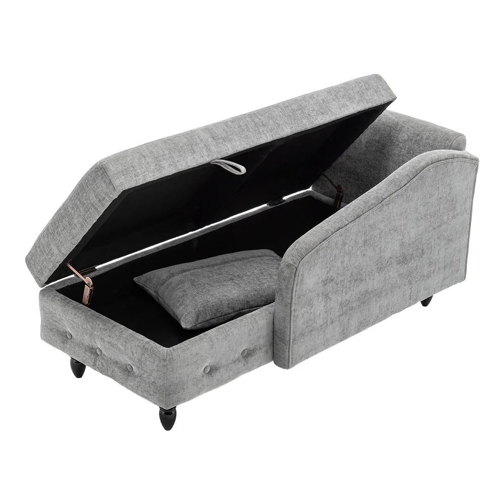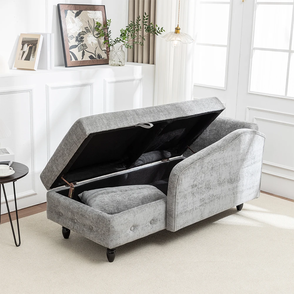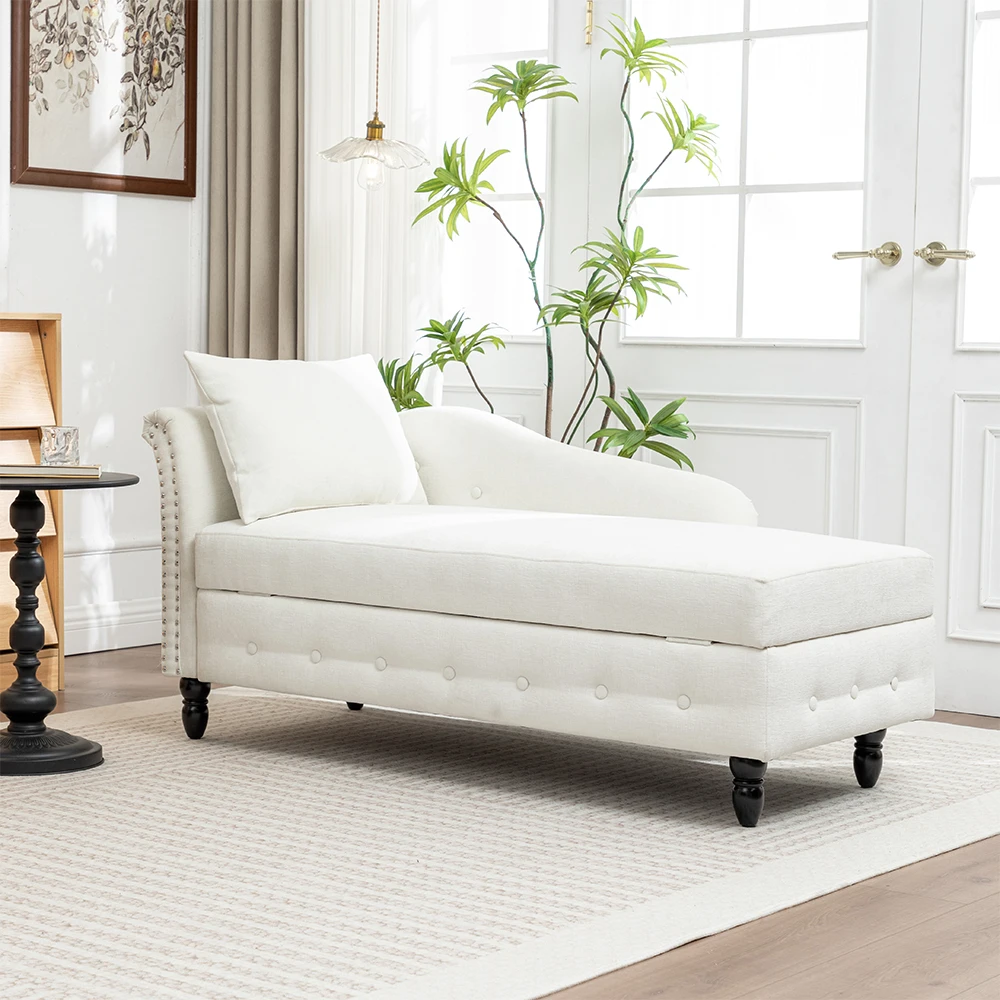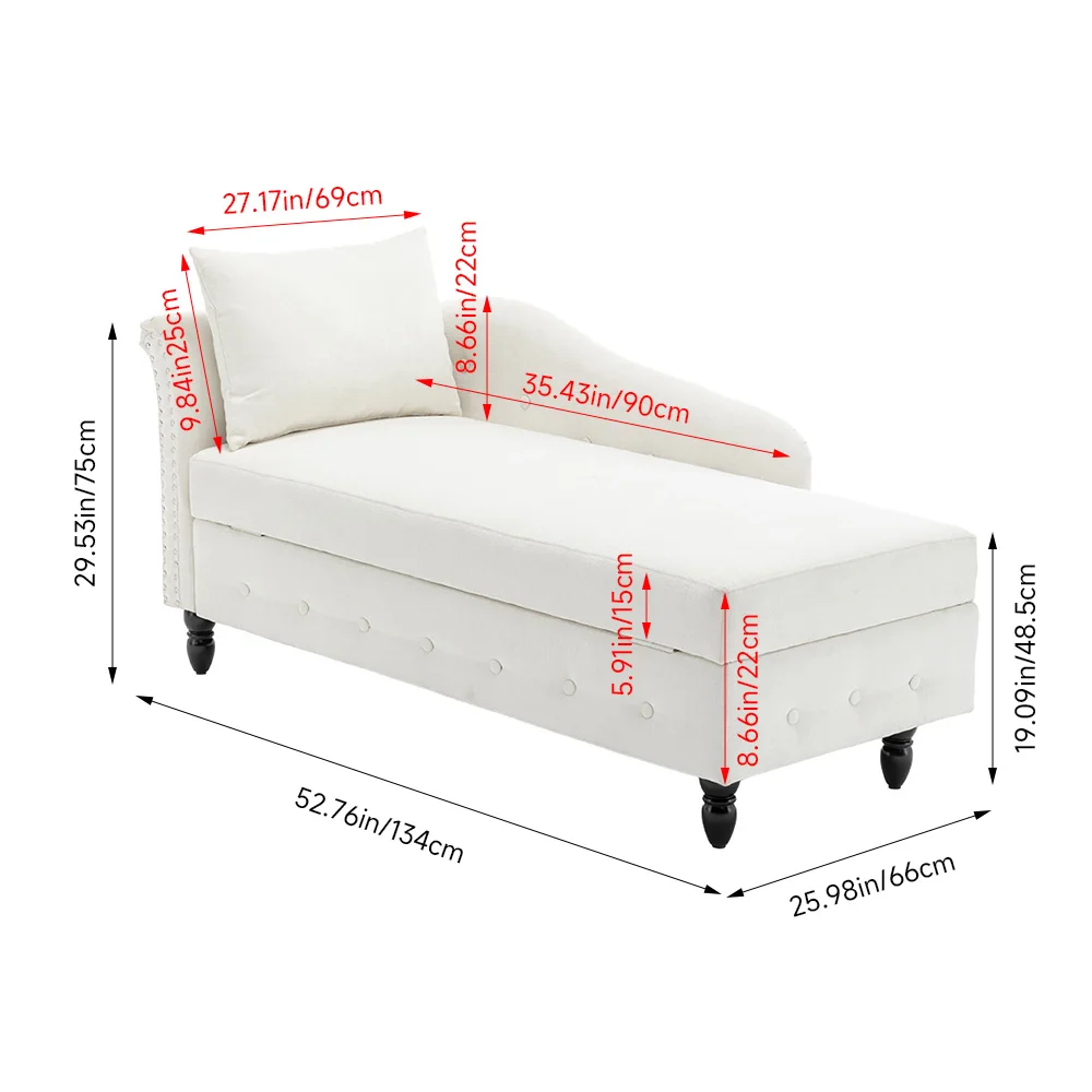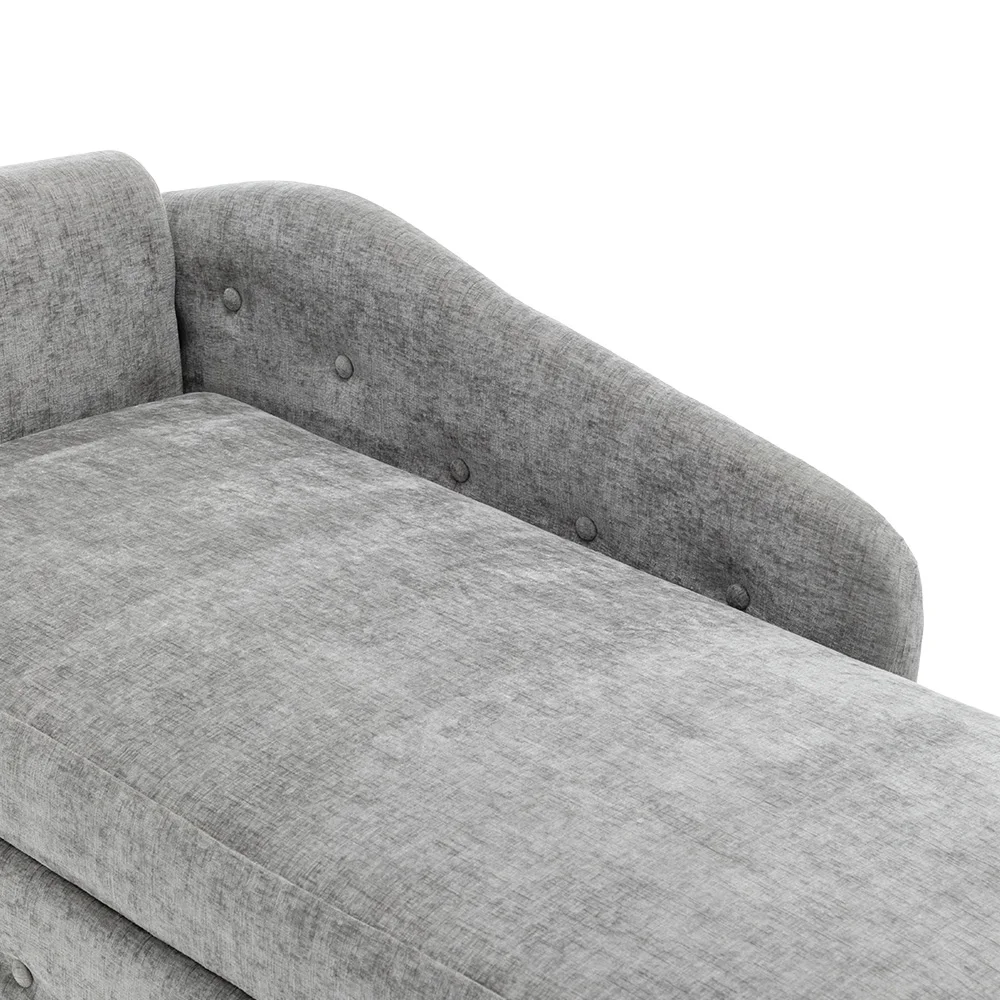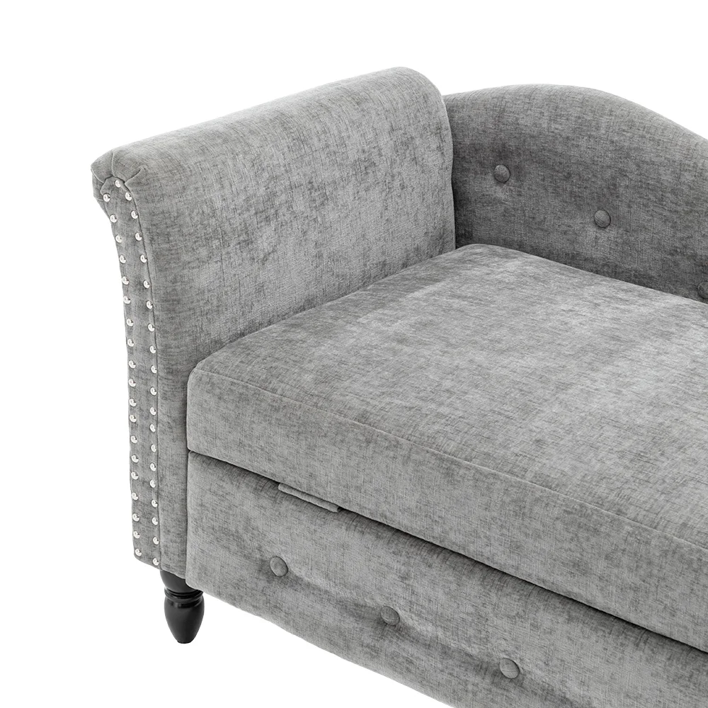 Lean back and unwind—your ideal lounge spot starts here. Upholstered in soft chenille and filled with high-resilience sponges, this chaise lounge offers lasting comfort and support. It exudes luxury and elegance with its rolled armrests and elegantly sloped back for a relaxed yet refined look. A matching pillow enhances relaxation by supporting your lumbar, while a flip-top compartment keeps essentials like magazines and blankets neatly stored. Built on a sturdy frame for durability and stability, this elegant piece blends style and function—perfect for any modern living space.