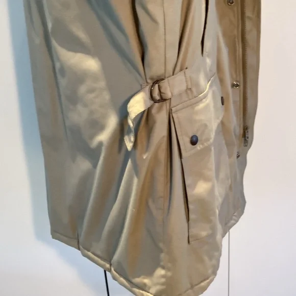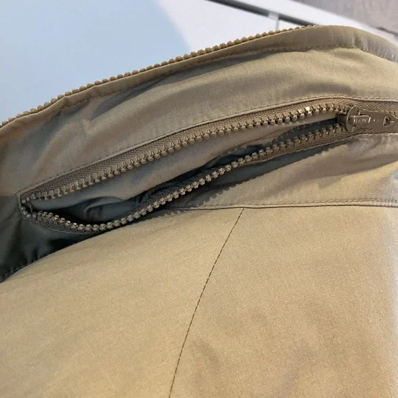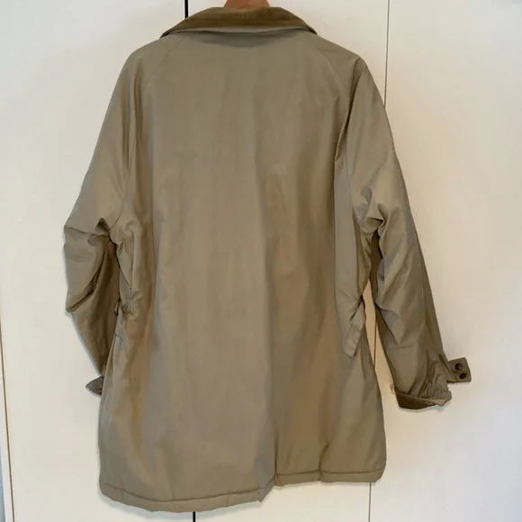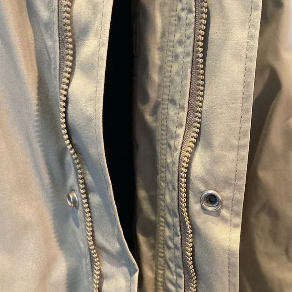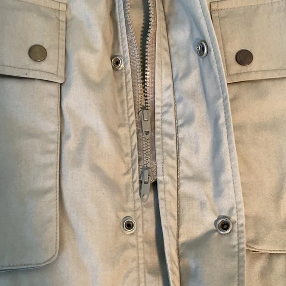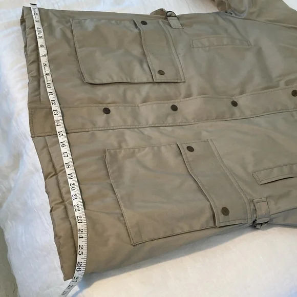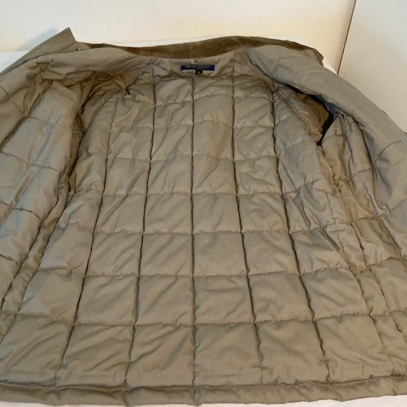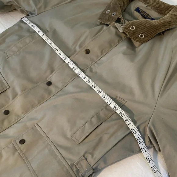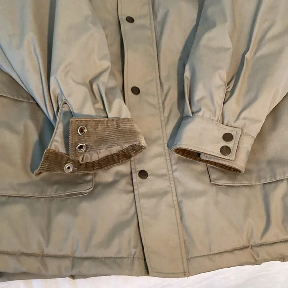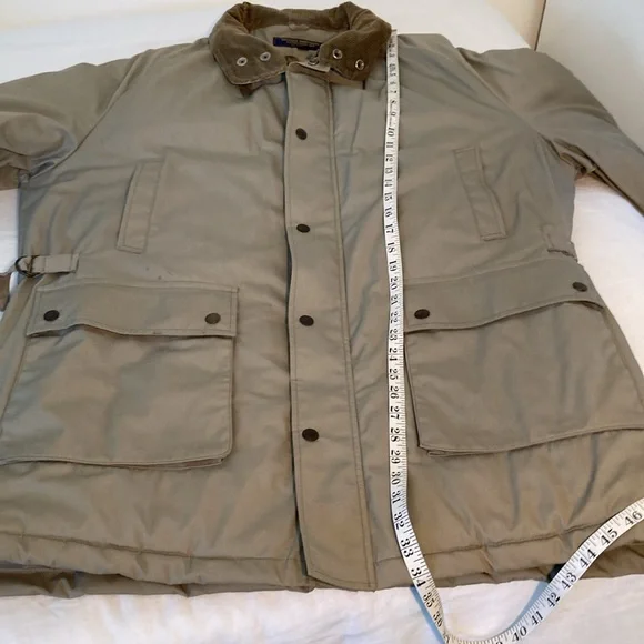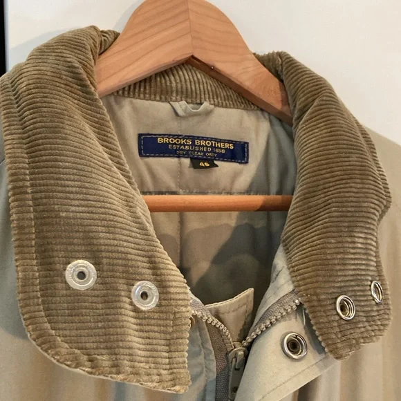 Brand: Brooks Brothers Established 1818Field winter coat utility jacket with corduroy at collar and cuff wrist bandZippered hidden hoodWaterproof thick cotton canvasQuilted interior for warmth Two ways front zipper and snaps closure Side straps adjustableHand chest front pockets with soft flannel interior Two large front pockets with two snaps closure Size 46Please refer to the measurements as shown Could fit XL to XXL Color: tan sage green kahki neutralNo fabric tagNo tear or worn areas but has some faint spots as shown and some discoloration in the collar and cuff corduroy partA dry cleaning could probably make it look nearly new. Overall great condition beautiful will certainly keep you warm. Reasonable offer welcome Fast shipping Sold as is It’s in excellent preloved conditionVery welll made jacket hard to find in these days