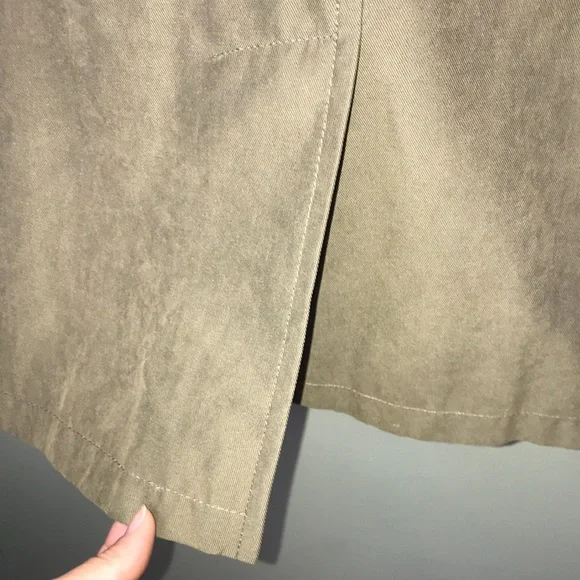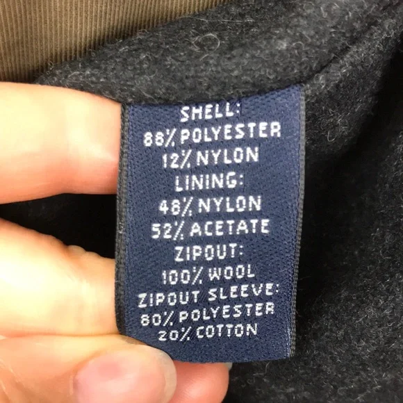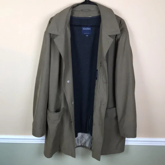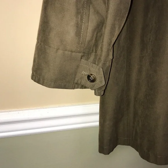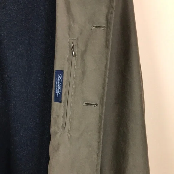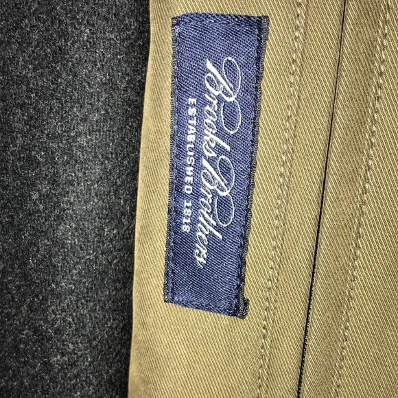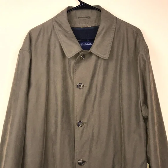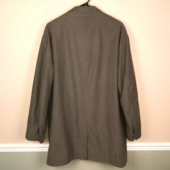 Brooks Brothers Men’s Olive Green Removable Wool Lined Liner Button-Up Jacket *Size tag removed - estimated to be a men’s size US Large based on measurements (please see below).Great condition.Shell: 88% Polyester; 12% NylonShell Lining: 48% Nylon; 52% AcetateInterior Zipout: 100% WoolSleeve Lining: 80% Polyester; 20% CottonA pocket on each side of exterior front.Zippered pocket on interior left.Button-closure on each exterior sleeve cuff.Wool liner with attached sleeve lining.Inner sleeve lining - can be removed with button-closure near cuff.Approximate measurements:Pit to pit - 22.5”Shoulder to bottom hem - 36”Sleeve length - 25.25”