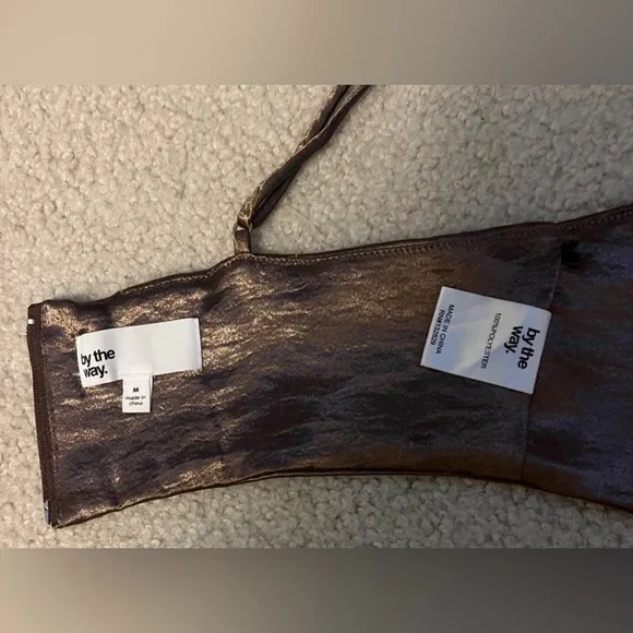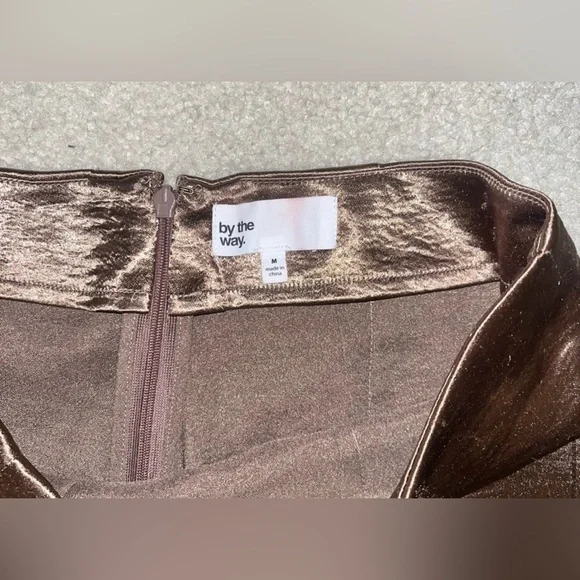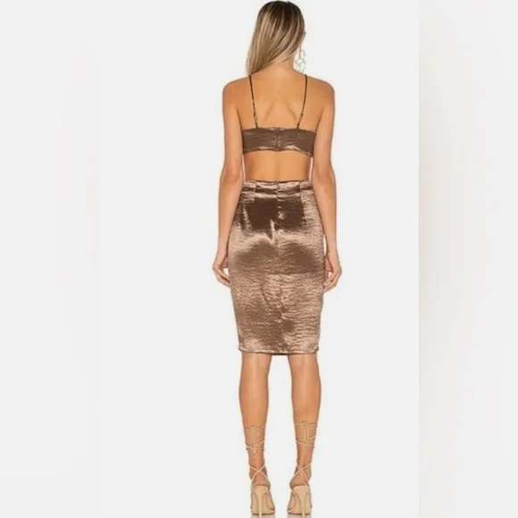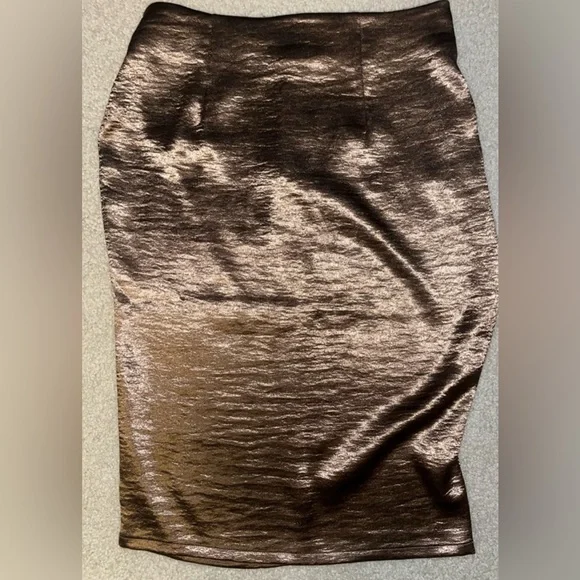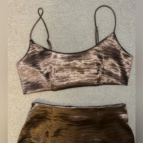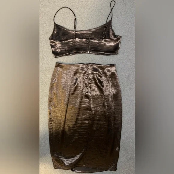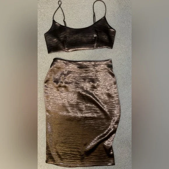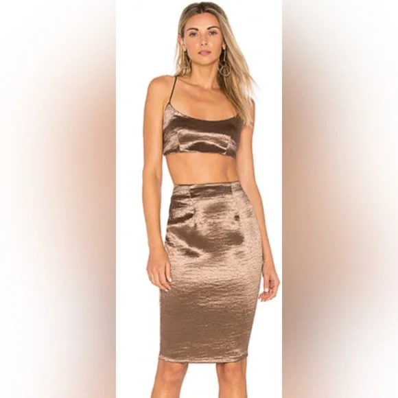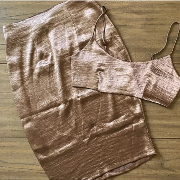 This skirt set is designed for a night out, featuring a sophisticated tan and gold color palette. The set of two pieces offers a sleek, form-fitting silhouette that elegantly contours the body, making it a standout choice for cocktail occasions.Step out in style with this elegant bronze satin skirt set.Perfect for any occasion, this set offers a sleek and sophisticated look. The top is a perfect crop bralet with a full zip back and the skirt is a high waist midi with zip detail. Both size medium in excellent condition with no imperfections.Super sexy and can be worn together or as separates.