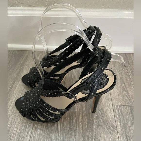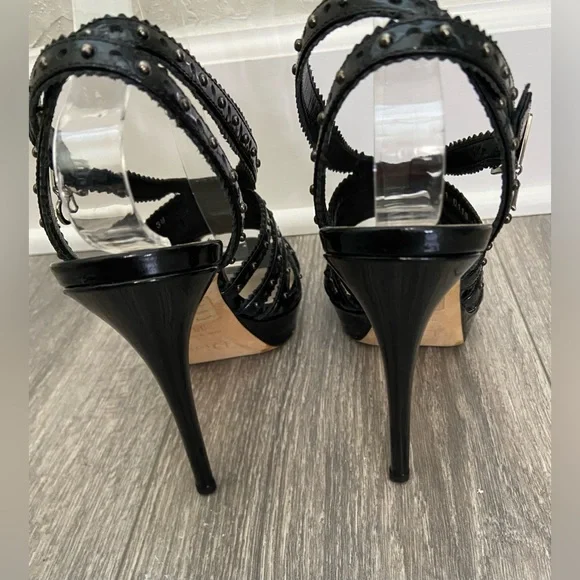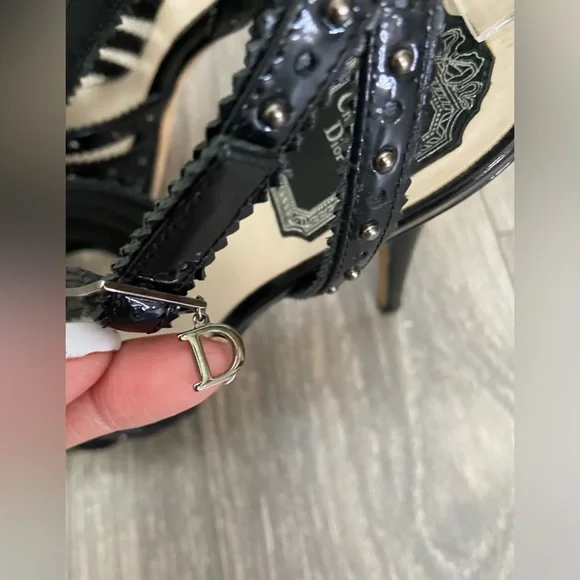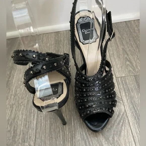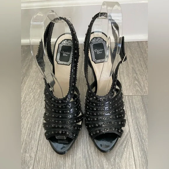ChristianDior Bonnie Black Leather Studded Open Toe Platform High Heels Size EUR38/US7Gorgeous and sexy studded stiletto high heels for spring, summer, weddings, parties, concerts, and vacations!Black patent leather Anthracite studsStraps overlap and cross in the back ankle area.Side buckle with D- charm buckle.Made In Italy.Excellent pre- owned condition.These beauties have only been worn 4-5 times.No show of wear except on bottom soles of shoes.Measurements approximately:5” heel1” platform heightTags: spring summer fall winter, rock ‘n’ roll, studded, Christian Dior, designer, high end, designer, concerts weddings, wedding parties, vacations special occasion after five parties, cocktail, concerts, etc.