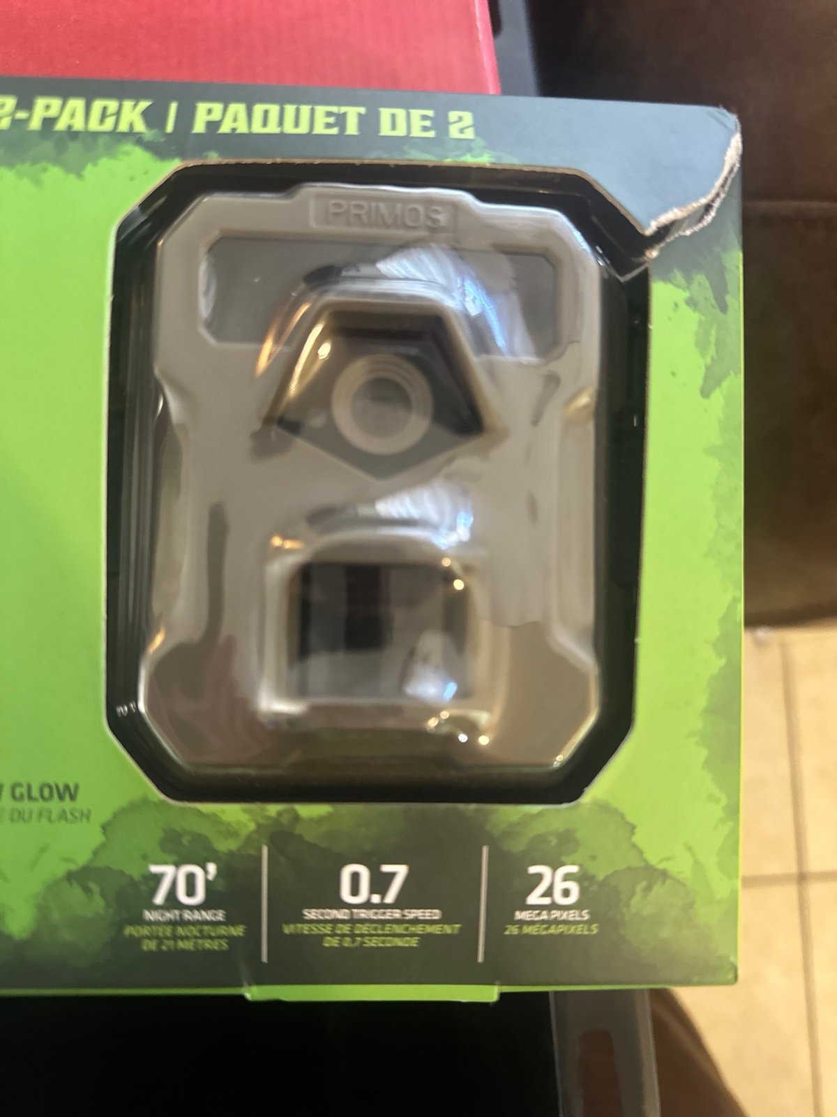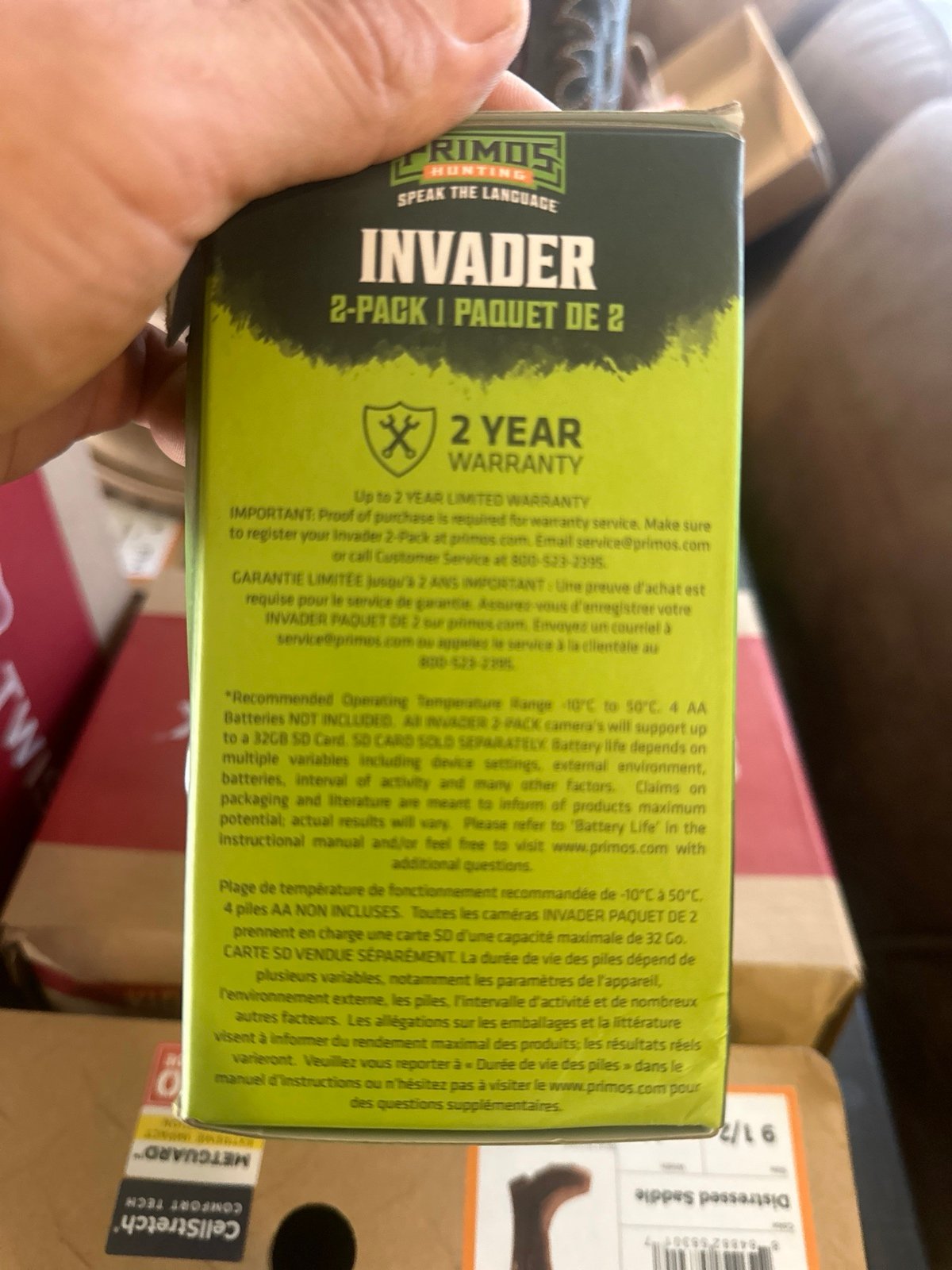 The Primos Hunting Invader 2-Pack Trail Camera Set includes two trail cameras designed for hunting purposes. Each camera has a detection range of 70 feet at night and a battery life of up to 1 year, powered by 4 AA batteries. The cameras are camo green in color and come with a 2-year manufacturer warranty. The model number is 119224CT2, and the set is made in China. Perfect for hunters looking to monitor game activity in the field.