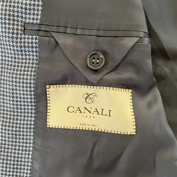 CANALIMade in ItalyDesigned for a dapper existence, Canal’s puppy tooth check blazer is a sophisticated choice for showcasing personal style - Sprezzatura! It's made from a tri-blend of silk, linen and wool that wrinkles perfectly.Retail $1895Size 58 R US 48 RColor Blue42% silk 30% linen 28% woolUpper Welt Pocket with Side Flap Pockets (Tuck to Slit Pockets)Surgeon Cuffs Prepared for Fully-Functioning ButtonsSingle Breasted Notch LapelTwo Button ClosureRear VentsCondition New Without Tags*wrinkled from storage*buttons for functioning cuffs are NOT providedApproximate Measurements:Shoulder 20” Chest 48” Length 31” Sleeve 36”8-08230.7H