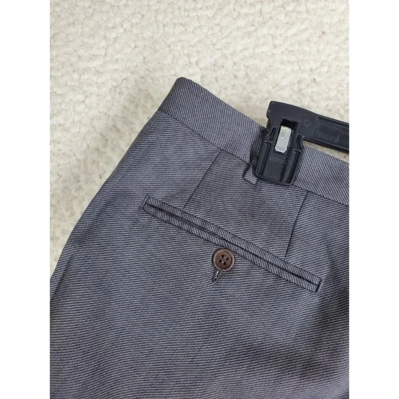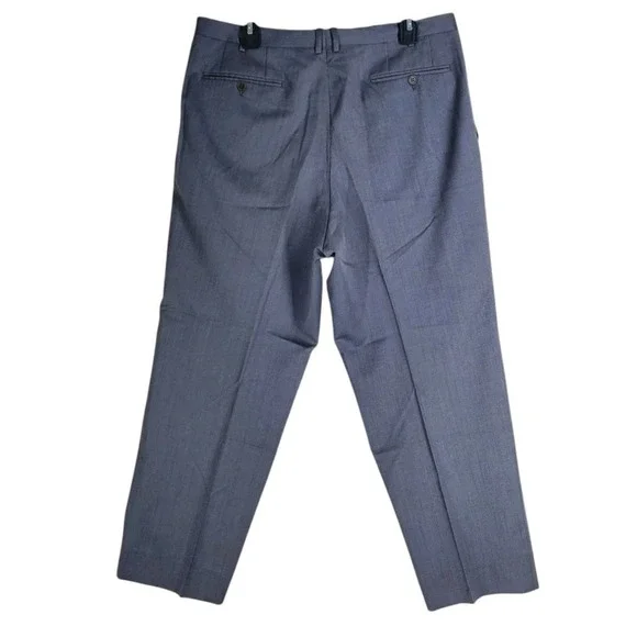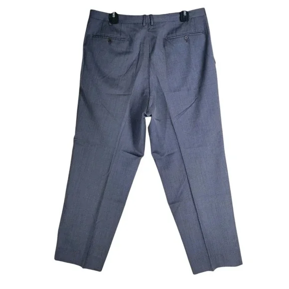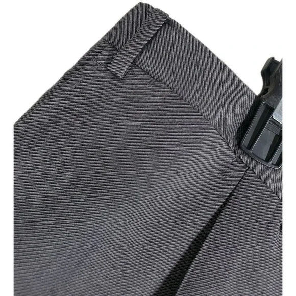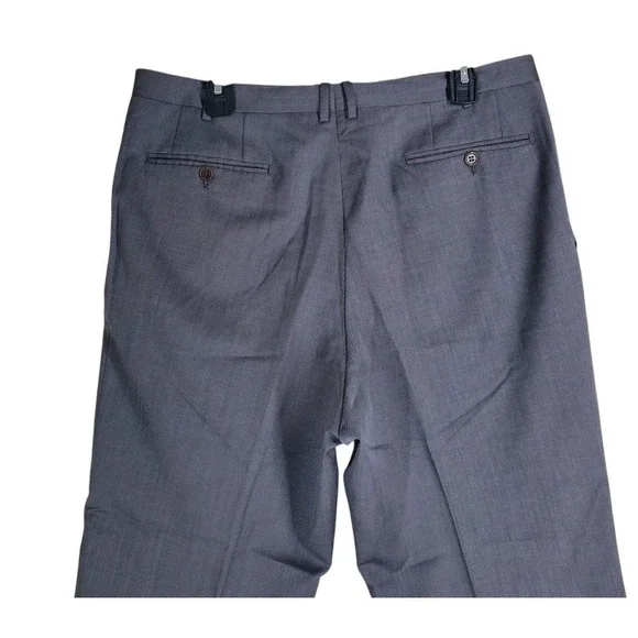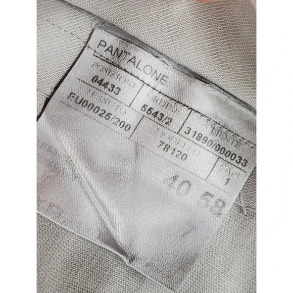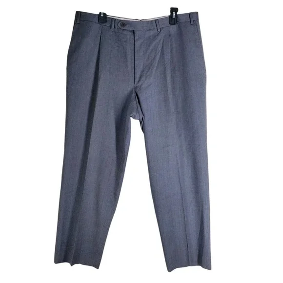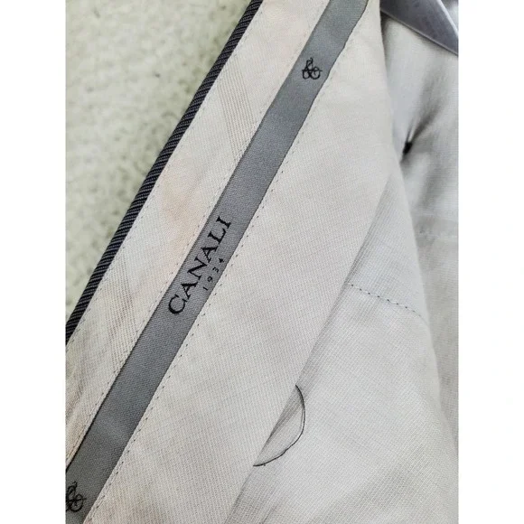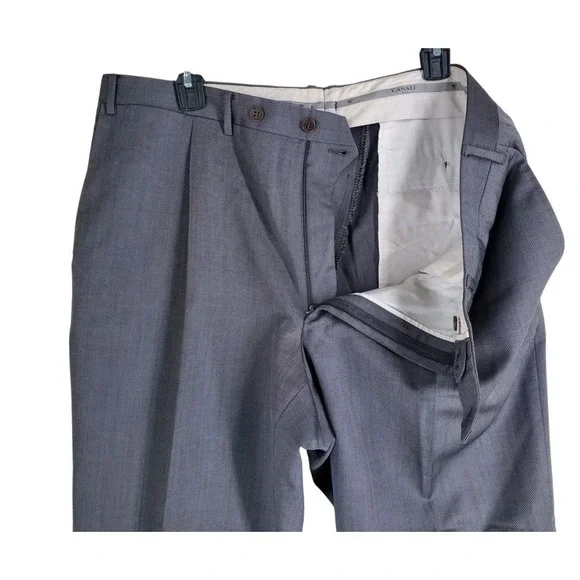 In very good condition.This is a pair of Canali pure wool dress pants for men in size 40. They are gray in color with a wide tapered leg and a pleated front design. The waist size is 37 inches, and the inseam is 29 inches. These pants feature a button and zip closure, slash pockets, and are designed for formal occasions. The brand is Canali and the material is wool, perfect for all seasons.1687