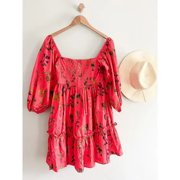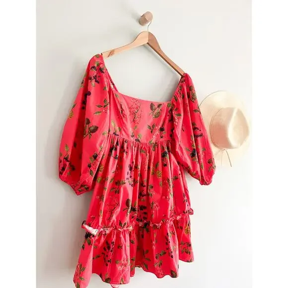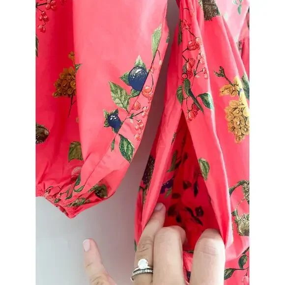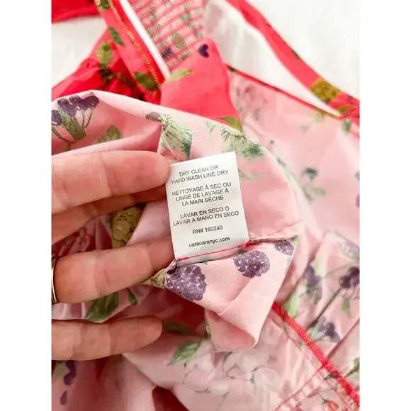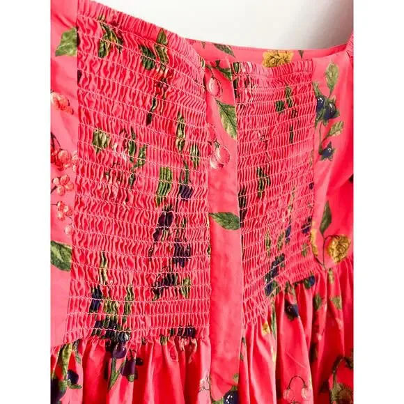 Cara Cara Sip Sip Dress in Botanical Allover Coral Women's size extra smallExcellent pre-owned conditionFabric: Mid-weight, non-stretch poplinPuff sleeves with elastic trim, can be worn on or off-shoulderSmocked elastic and hidden zip at backGathered waist and ruffle hemOn-seam hip pocketsFloral fruit printShell: 100% cottonUnlinedDry CleanApproximate flat measurements:Pit to pit: ~15.5" (has stretch from back smocking)Waist: ~14.25"Length: ~34"Same or next business day shippingSmoke free, pet free homeThanks for looking!