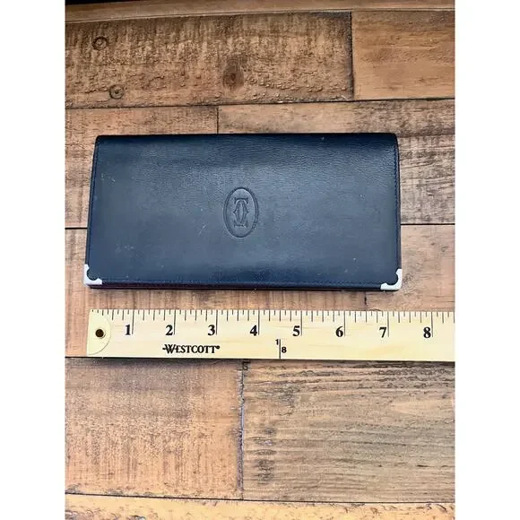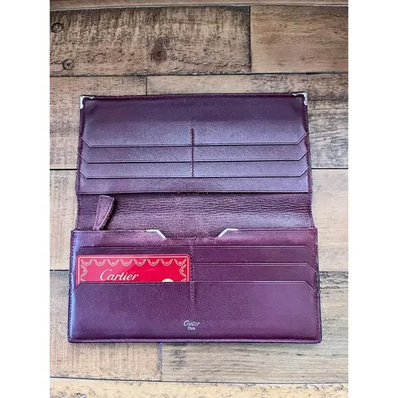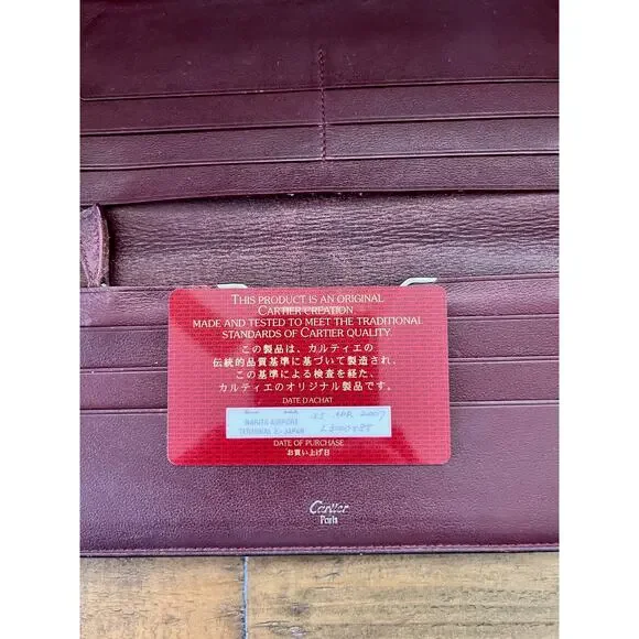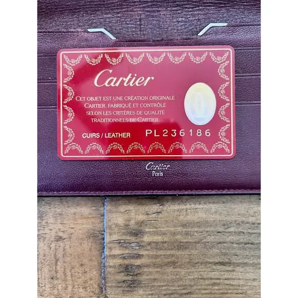 #1946CARTIER Long wallet Cabochon Bordeaux Leather With Authenticity CardPre-owned Cartier Long Black Leather wallet with Burgundy interiorBeautiful soft leather12 card slotsBill compartment and zippered coin pouchMeasures: 7.25 inches x 3.5 inchesHas some scratches, scrapes, rubbing etc due to being pre-owned SEE PHOTOShips Quickly!Please look at all the photo's and read description for the item.May be loose threads, scrapes, scratches, rubbing, tarnish, separation etc. Will do my best to describe item to the best of my ability. There may be a possibility I may have missed something.Any major flaws will be noted in the photo's.All Measurements are approximate.Sold as isColor of item may differ based on each person's monitors being different.All Measurements are ApproximateALL SALES FINALPlease carefully review your order before confirming your purchase. All sales are considered final. We do not offer refunds or exchanges for any item sold.Keep in mind some items may be vintage, which can cause a peeling/stickiness/odor over time due to age of product and should be handled with care.