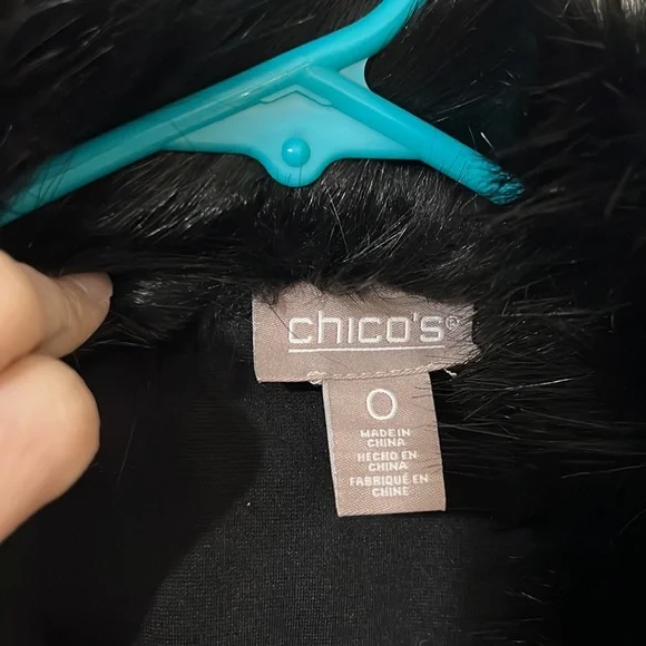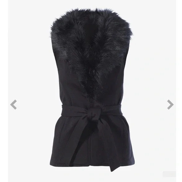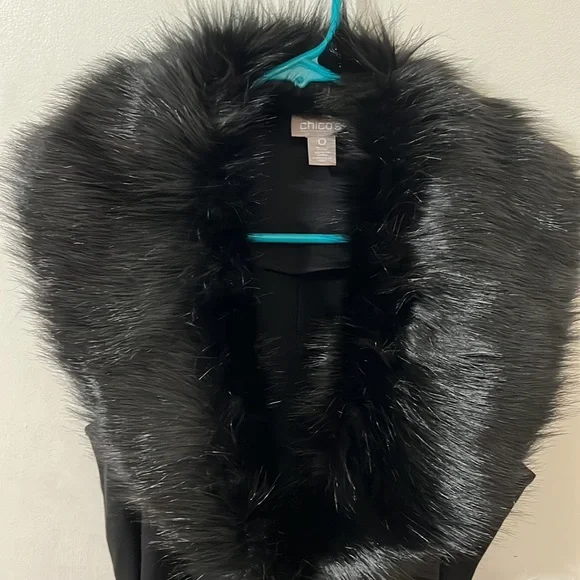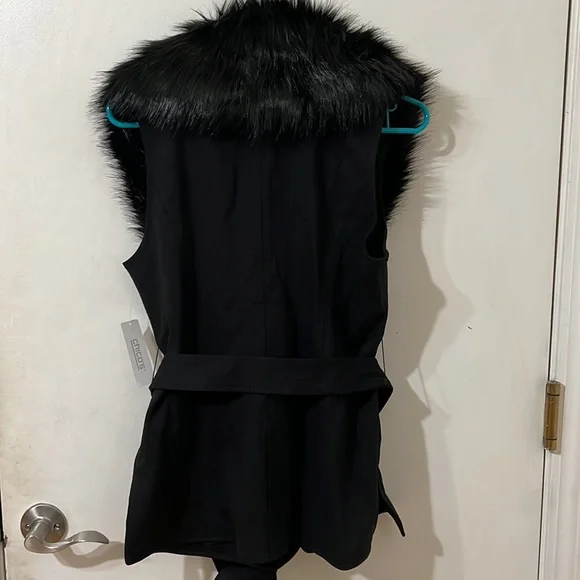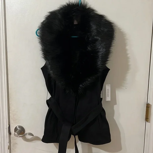 Chico’s Faux-Fur Pointe VestBrand new. Never worn.It’s a celebration of style in this women's vest with dramatic removable faux fur collar. When the cooler weather calls for a fabulous outer layer, pull out this Ponte style finished with plush faux-fur trim. Taper the waist with the self-tie belt to streamline your silhouette.Hook-and-eye closure.Sleeveless.Self-tie belt.Front pockets.Length: 28".Rayon, nylon, spandex.Machine wash. Imported.
