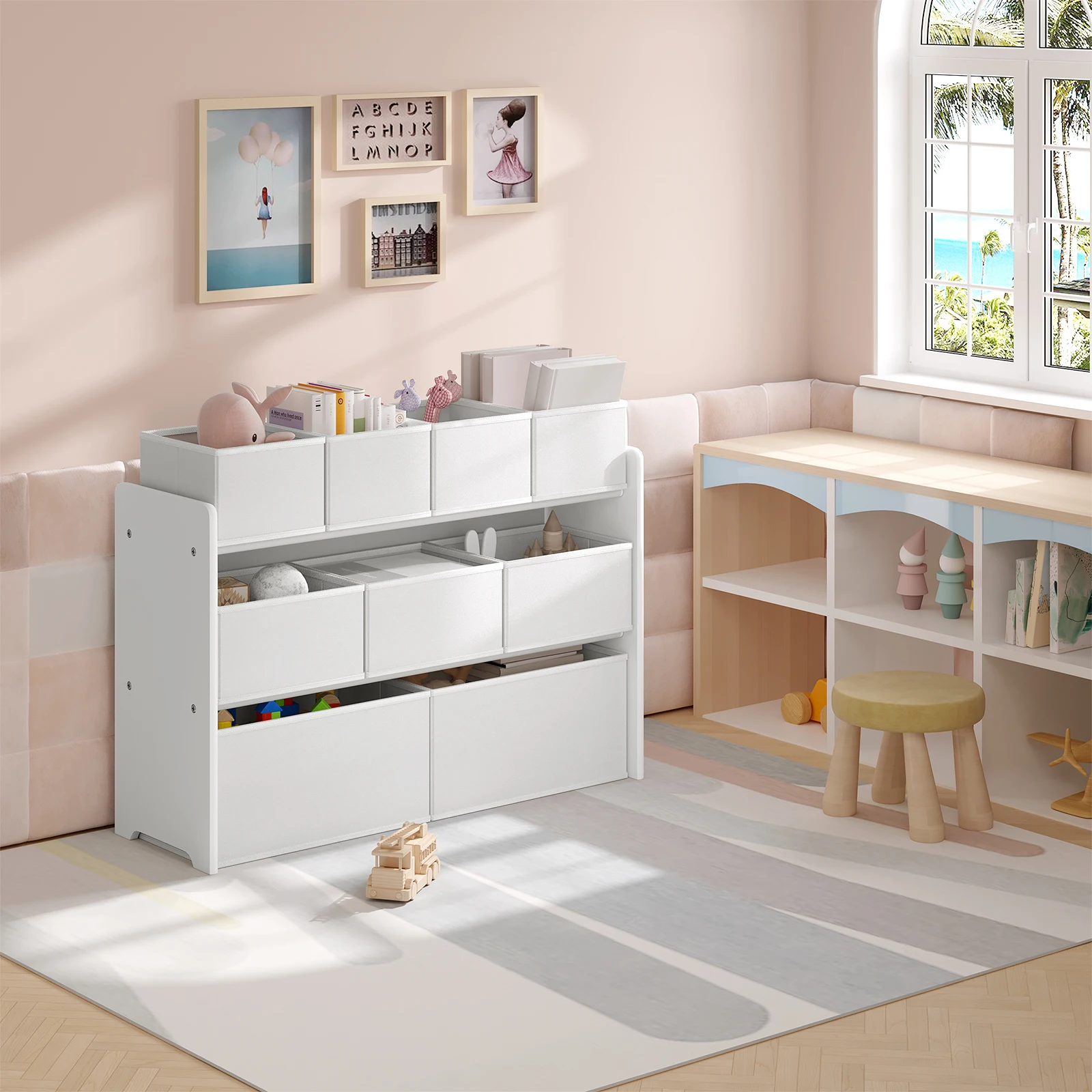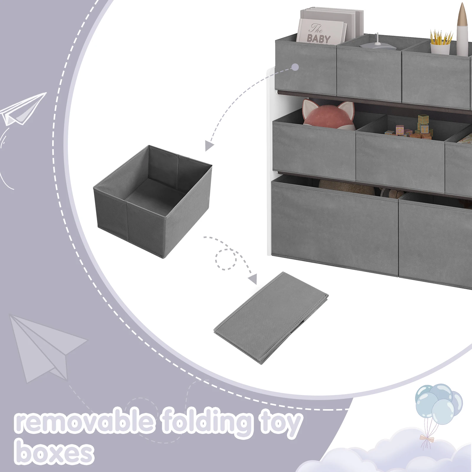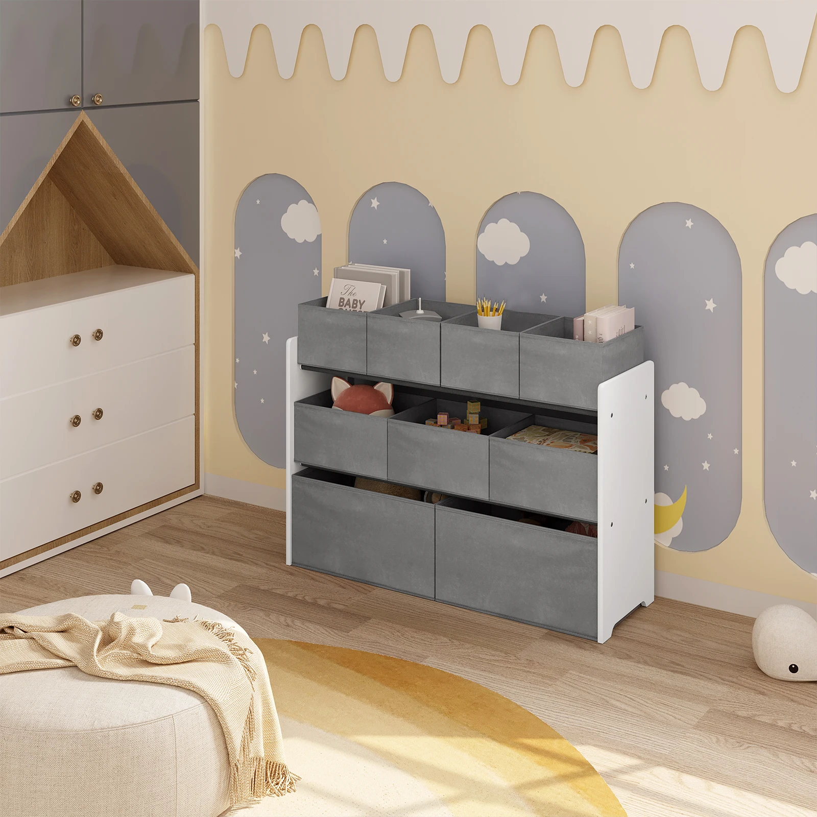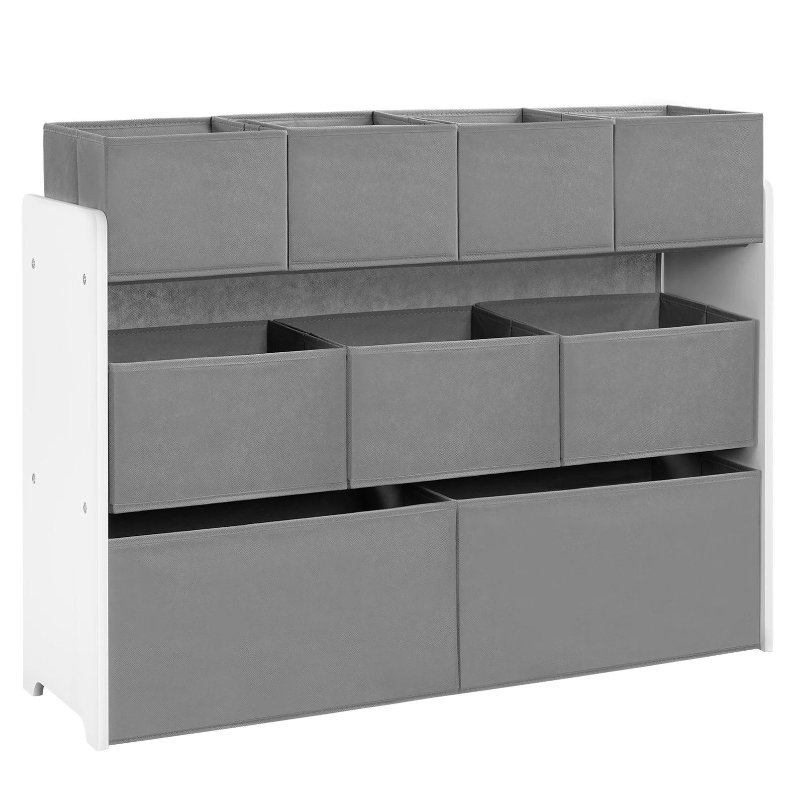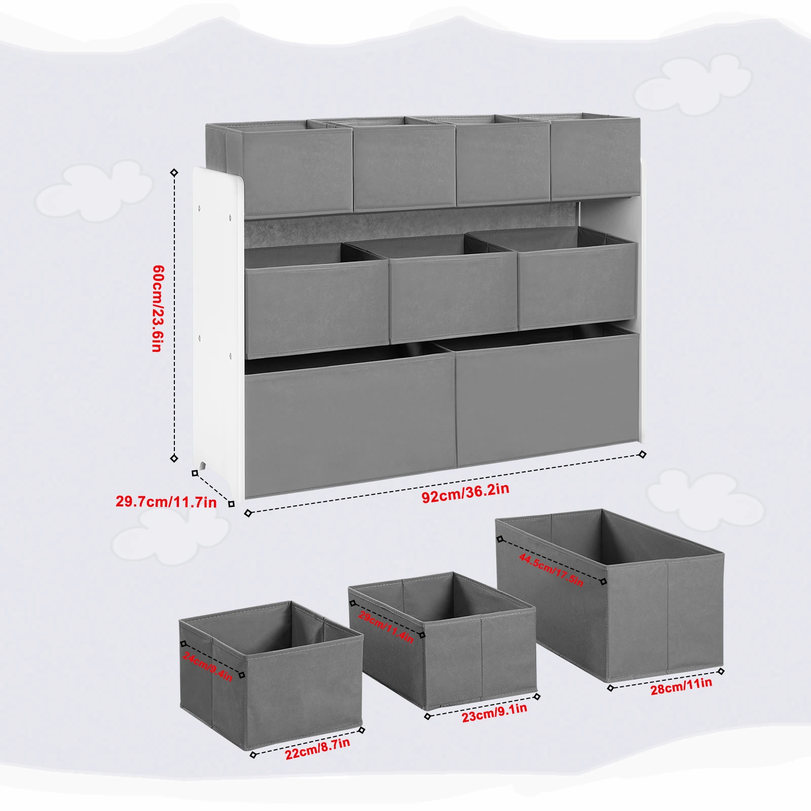 • LARGE STORAGE SPACE The kids shelf has 9 removable non woven fabric toy boxes in 3 sizes. They provide ample storage space so children can sort their toys and snacks and keep the play or bedroom tidy