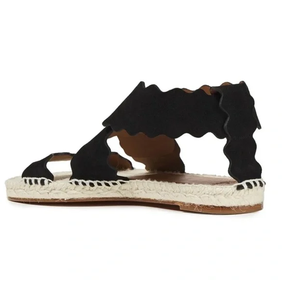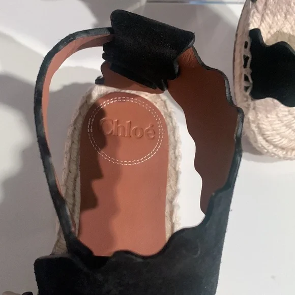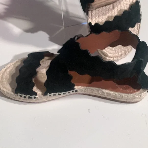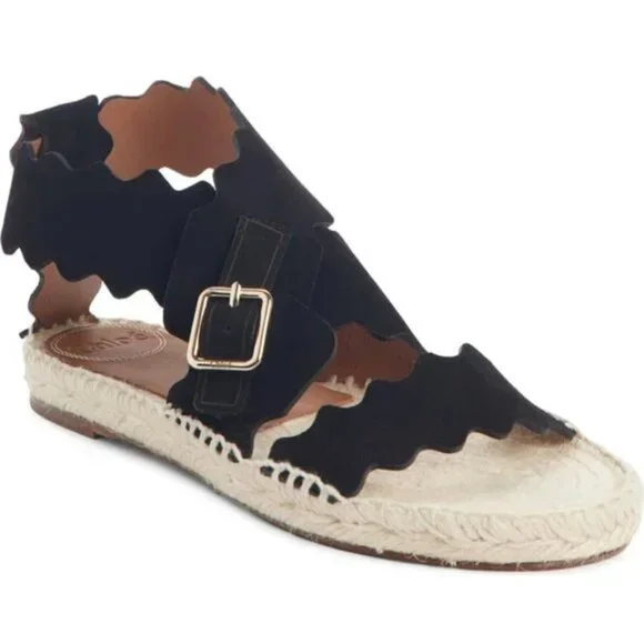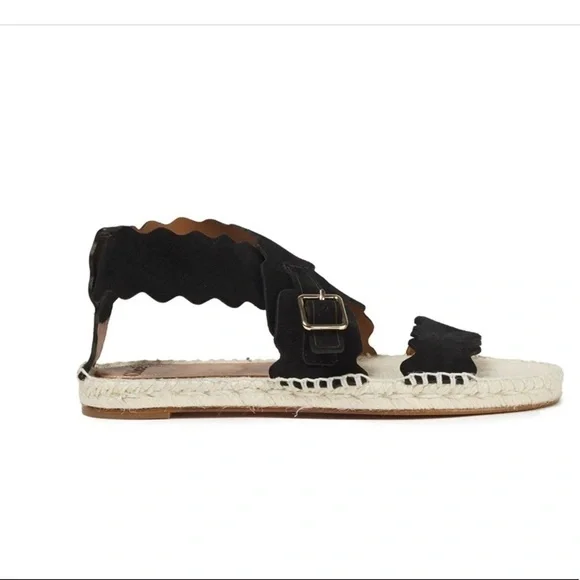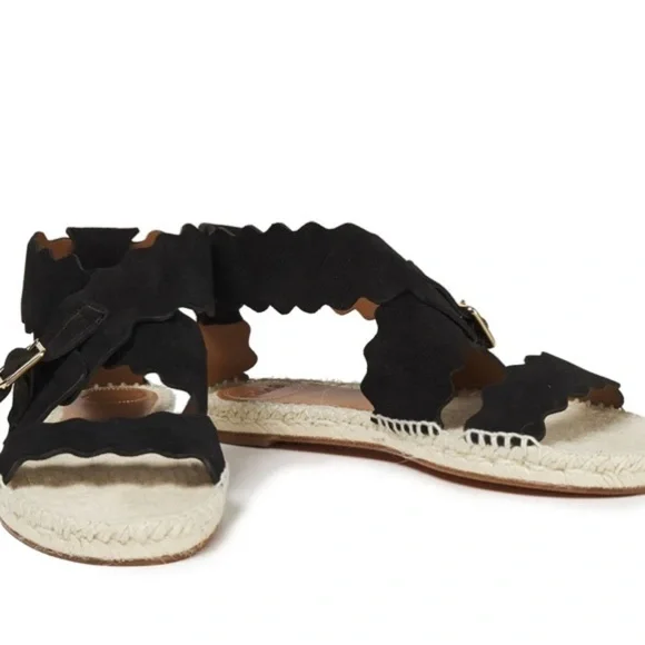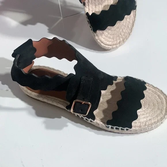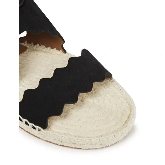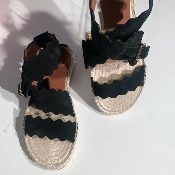 Chloe Lauren Scalloped Black Suede Strap Espadrille Sandals Womens Sz 7 US NWOTNew Without TagRefresh your collection with these lauren sandals from Chloe. Crafted with a buckle fastening to the side, this piece features a smooth suede upper and a woven sole. Finished with textured sides to the straps, this piece is not one to be missed.- Brand: Chloe- Color: Black, White- Size: US 7- Scalloped criss cross strap- Adjustable strap with buckle closure- Suede upper, leather and jute lining and sole- Woven sole- Made in Italyboho, bohemian, going out, beachy, summer, cottagecore, chic, trendy, footwear, resortwear, casual, garden party