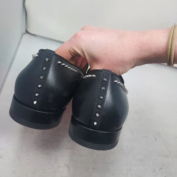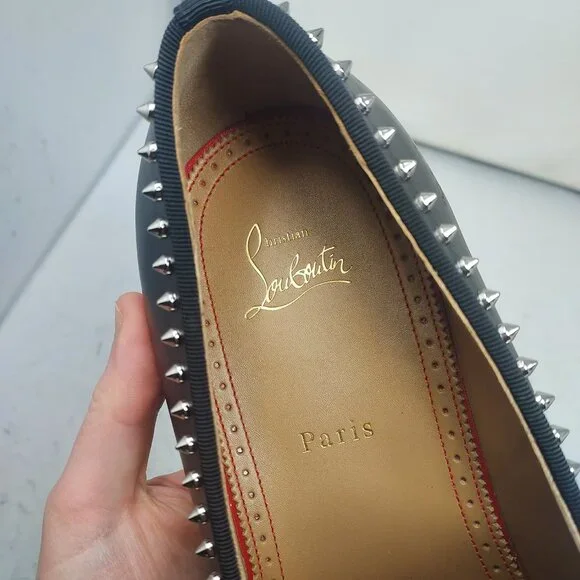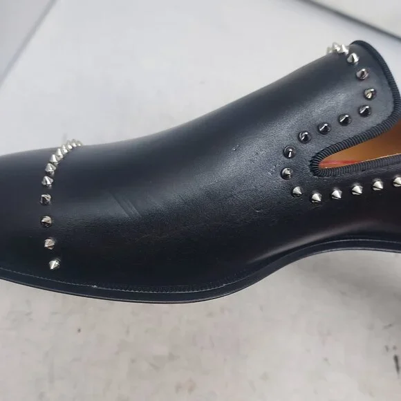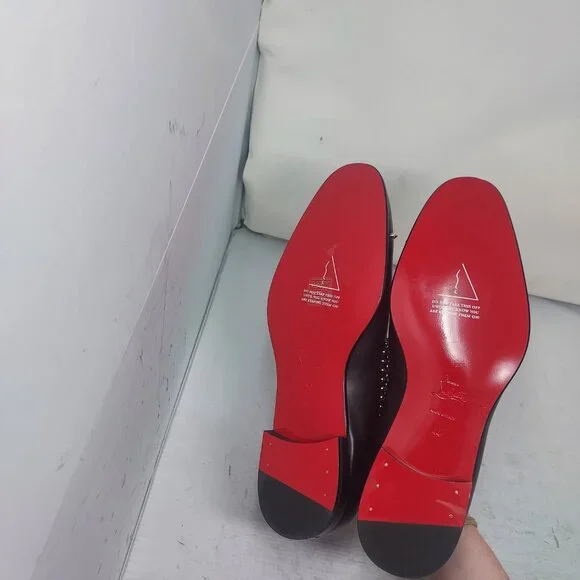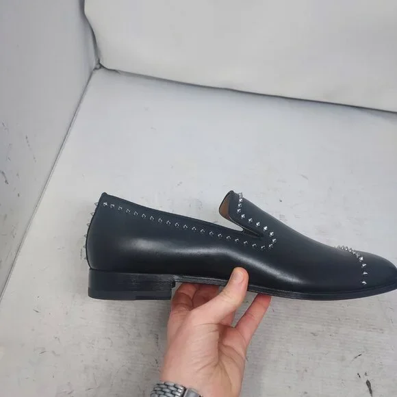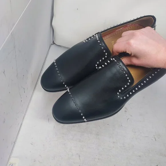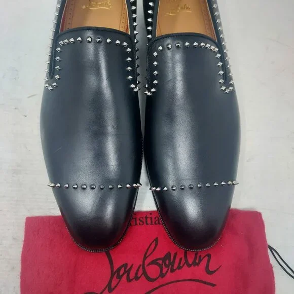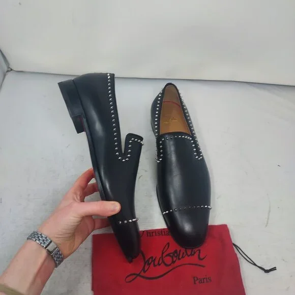 Christian Louboutin MENS Dandy Cloo Black Leather Spike LoaferSize EU 44 US 11 MENSNew never worn100% AuthenticComes with fabric dustbag (Not Louboutin)Please note faint lines/dents from studs in storage as shown. Please note faint lines on bottom as shownSlip on all black dress loafer with silver mini spike stud trimStacked heelRound cap toeNotched vampGrosgrain trimSlip-on styleSignature Louboutin red leather outsoleMade in Italy