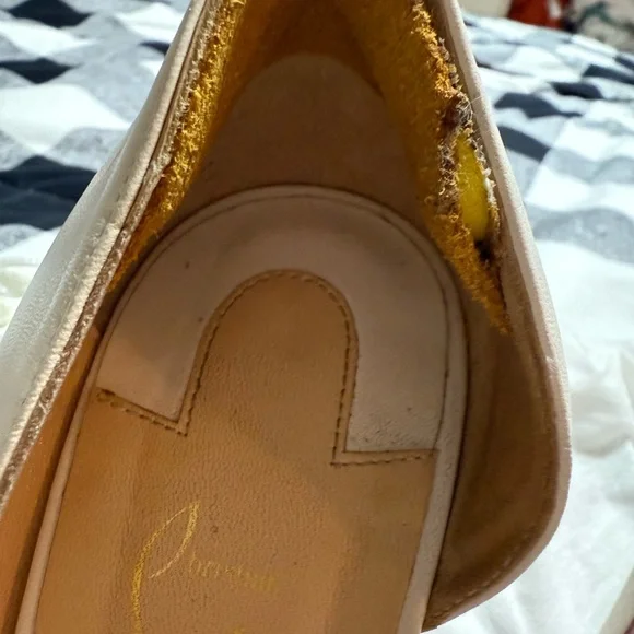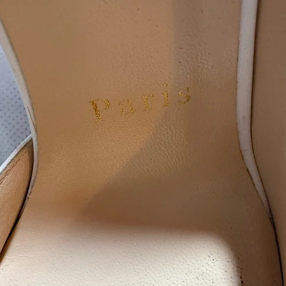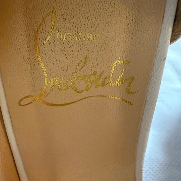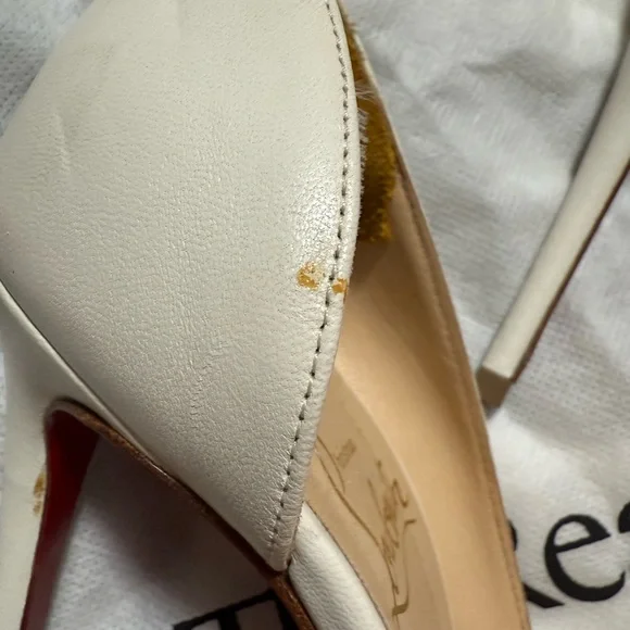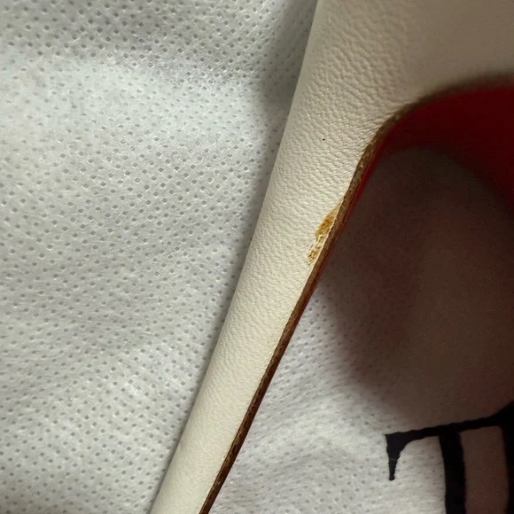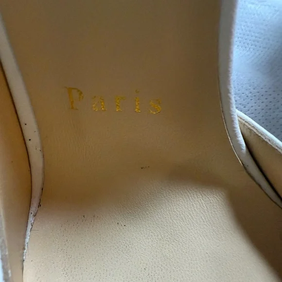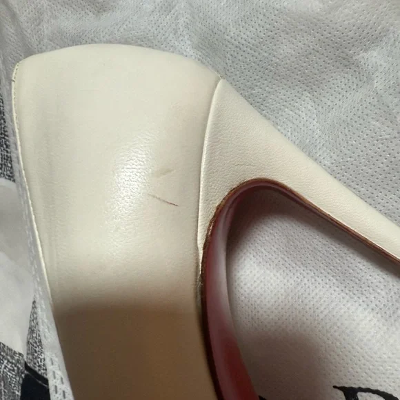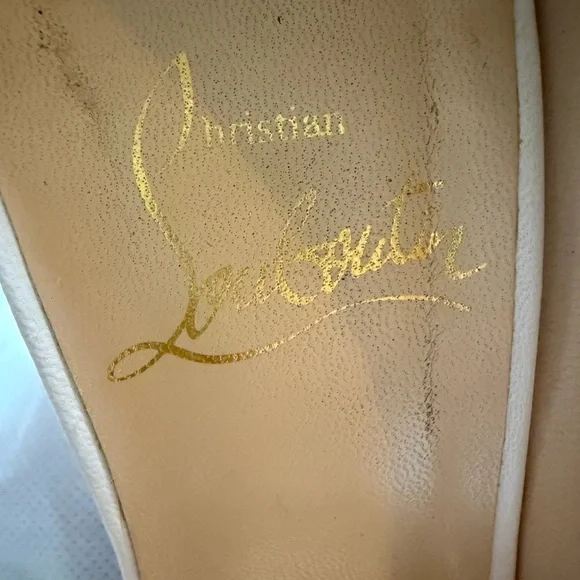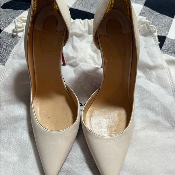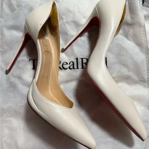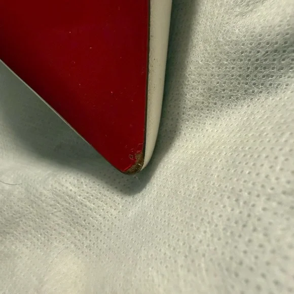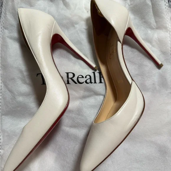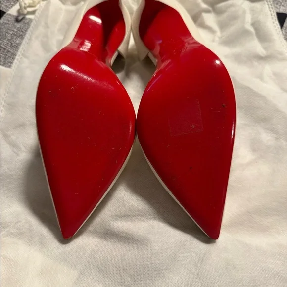 These Christian Louboutin heels feature a striking combination of white and red, highlighted by the brand's iconic red lacquered soles. The classic stiletto design and elegant pointed toes showcase the luxury craftsmanship synonymous with Louboutin, making them a standout choice for any sophisticated occasion.