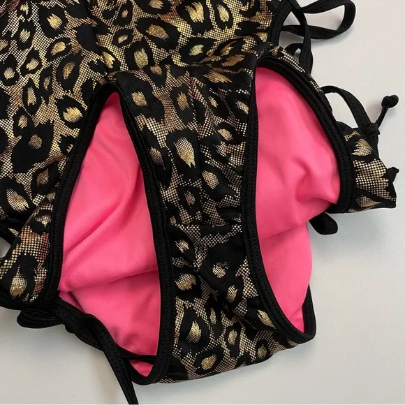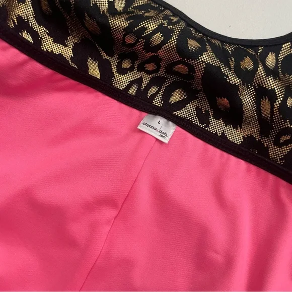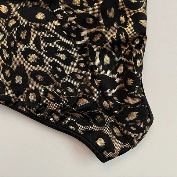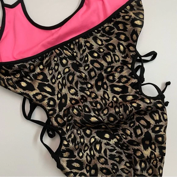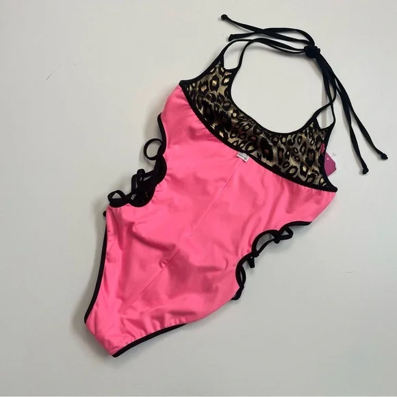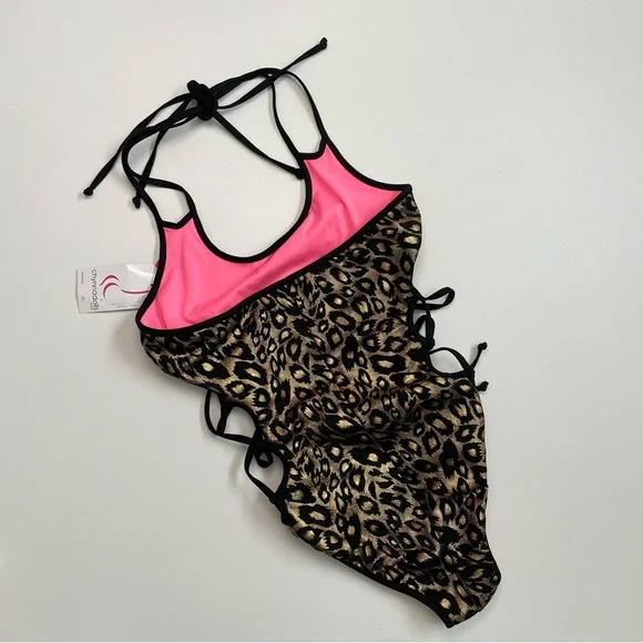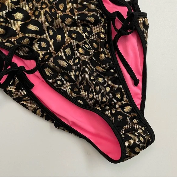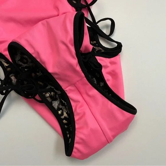 Chynnadolls Swimsuit Vegas Lace Up One Piece Lined Leopard Hologram Print BlackWho says one pieces aren't hot? This is an eye catching one piece in hologram leopard print with lace up detail on the sides and loop double strap detail. It hugs the body in all the right ways accentuating your curves. Fully swimwear lined.No Signature Scrunch in the back. New with tags. No flaws. Color: Black Gold ( Neon Hot Pink Lining )Size: L6