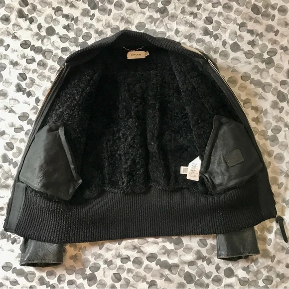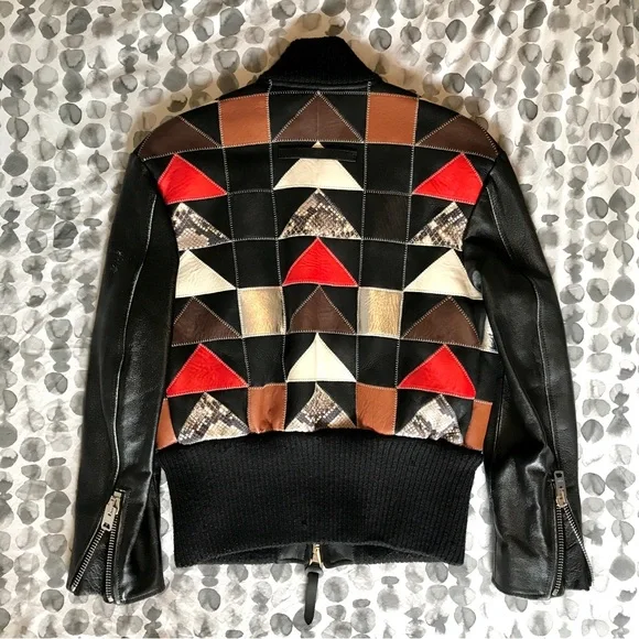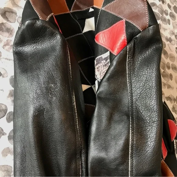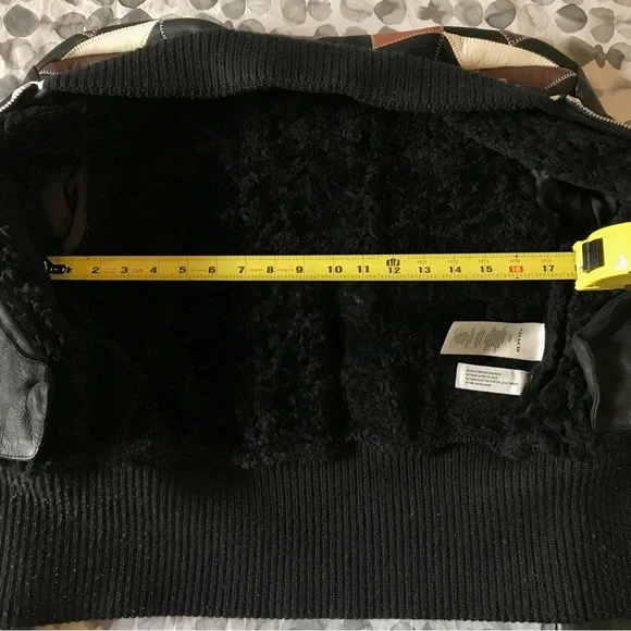 Beautiful jacket with exquisite patchwork. The body is lined with REAL shearling (sheepskin) fur. Sleeves are lined with satin.Edges and seams of sleeves are stylishly distressed. One sleeve has a distressed scuff (photo). Came that way new.Marked size 8. Fits like a 6. Listing as Medium.Pit to pit measured inside: 17.5” (photo)Purchased new, worn once. Excellent condition.