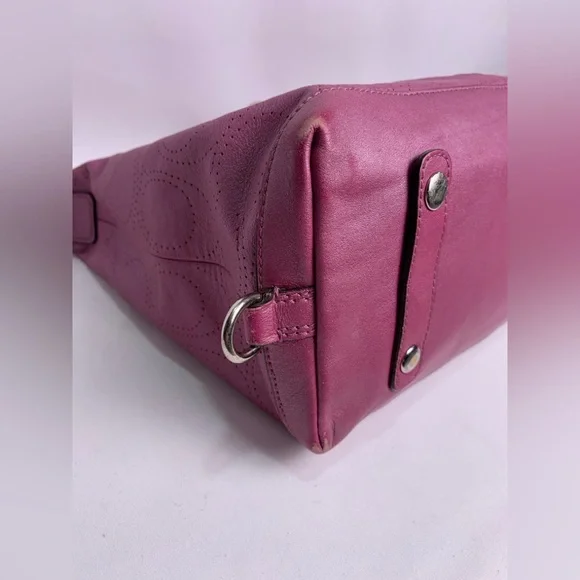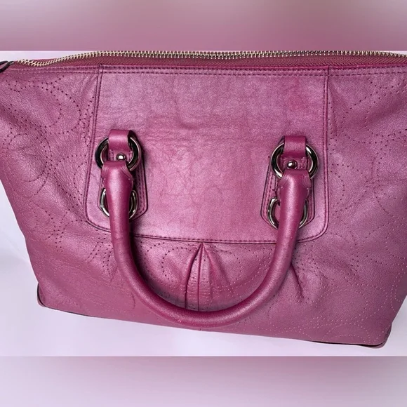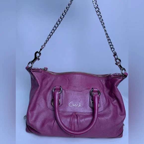 See my other listings for beautiful designer jewelry and bags!!Coach Ashley Leather Convertible Hobo Bag Metallic Mauve AUTHENTIC perforated logo leather exterior with silver hardwaretop zip closuredouble leather rolled straps, drop of 5"interior lined with 1 zip and 1 slip pocketMeasures 12.5"L x 8.25"H x 5"WThere are different ways that bad can be configured and carried. That's what makes this bag so unique. It will include a non-branded chain strap.Condition:Pre-Owned very nice with light signs of use. Corner rubbing and some wear or loss of color. There are a few blemishes on the supple leather. Bag is still in great shape and has much life left in it.Please review all the pictures, zoom in and ask questions BEFORE purchasing. I post the maximum amount of pictures allowed.The photos are part of the description.Elevate your style with this elegant pink leather bag from Coach. Perfect for any occasion, this bag combines luxury and functionality.
