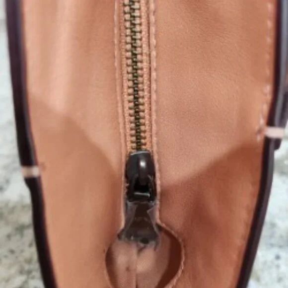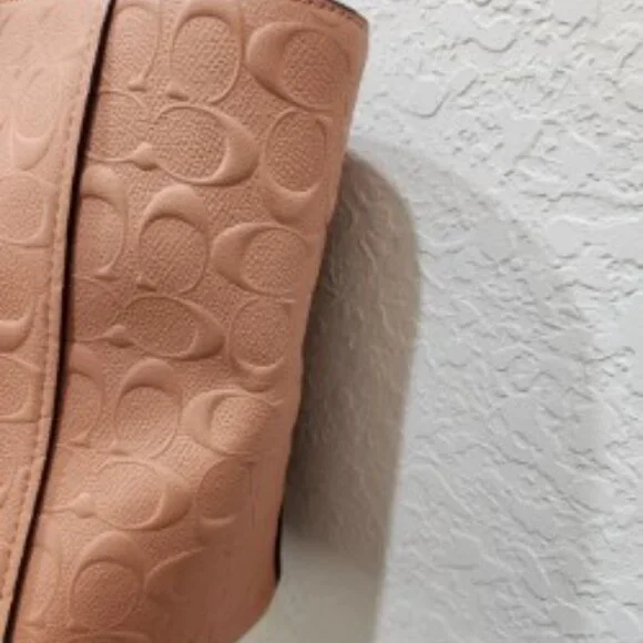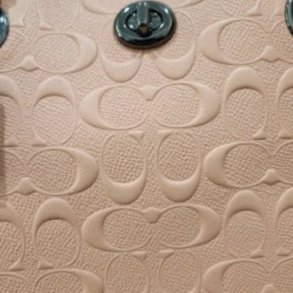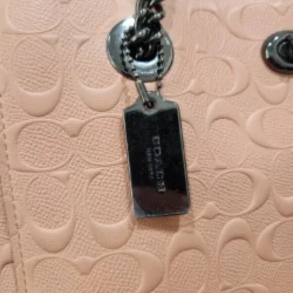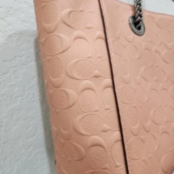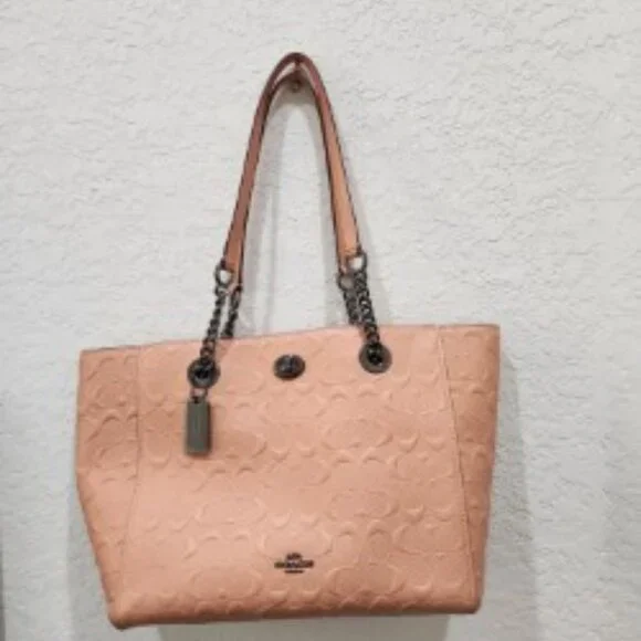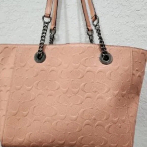 Beautiful Coral Coach Chain Tote in Signature LeatherNo 81880-577321Pre-Owned ConditionInside Zip, Cell Phone and multifunction pocketsZip-Top Closure, Satin Fabric LiningDual Handels with 9 1/4 dropPebbled Genuine Leather with classic Coach "C" in designCoach Logo Plate on FrontCoach Keychain and Zipper have original plastic on