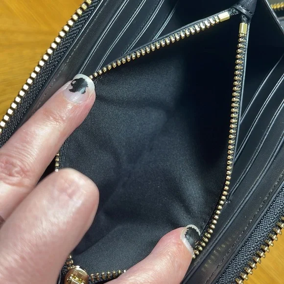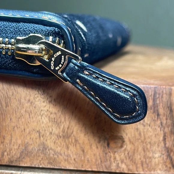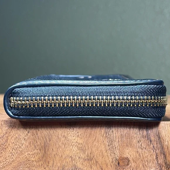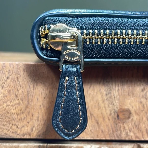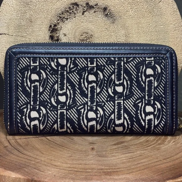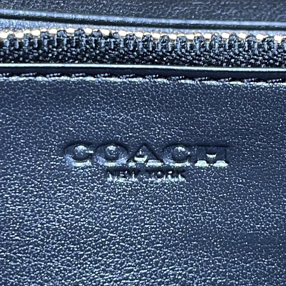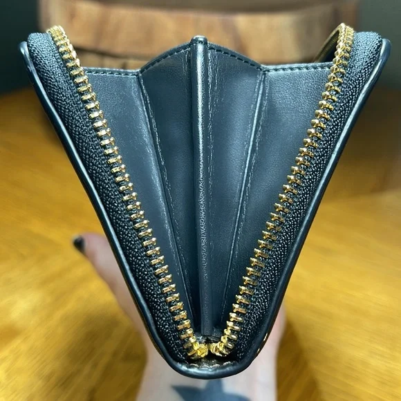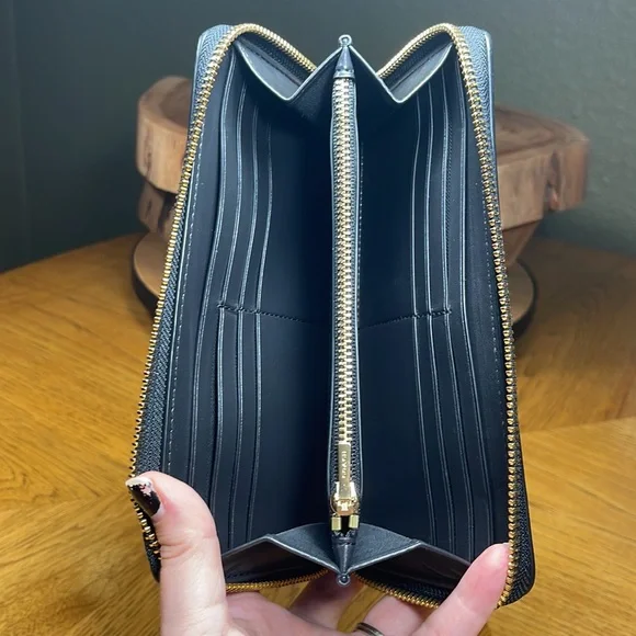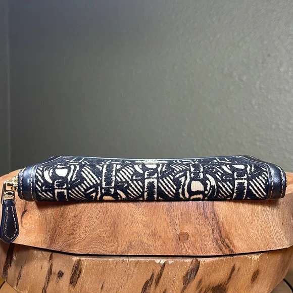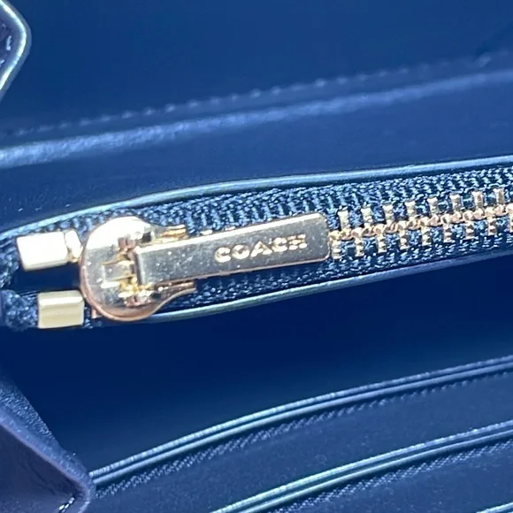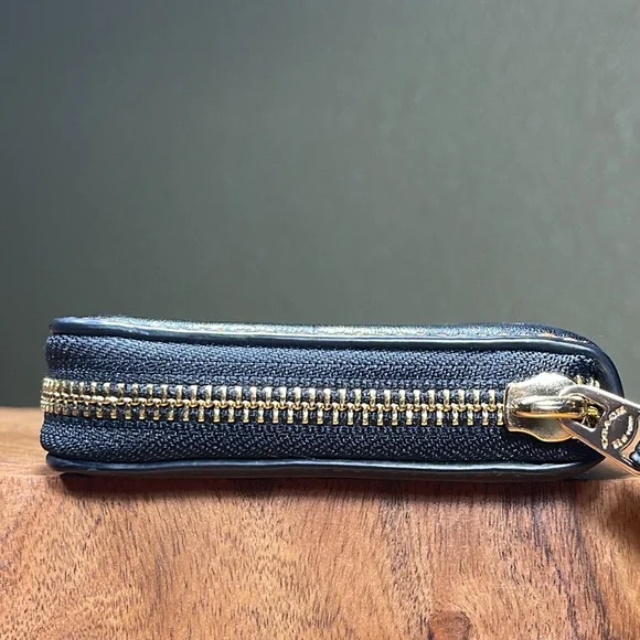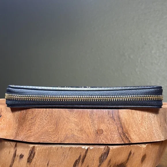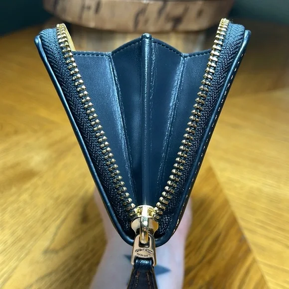 Coach Flocked Chain Print Accordion Zip WalletRefined Calf Skin Leather & Flocked Velveteen Coach C’s in a Chain Link PatternBlack & TanGold Hardware Zip Around ClosureInterior:Calf Leather & Black Fabric Lining12 Card SlotsFull Length Bill Compartments Zip Coin Pocket7 1/2”L x 4”H x 1”WExcellent Condition View All Photos