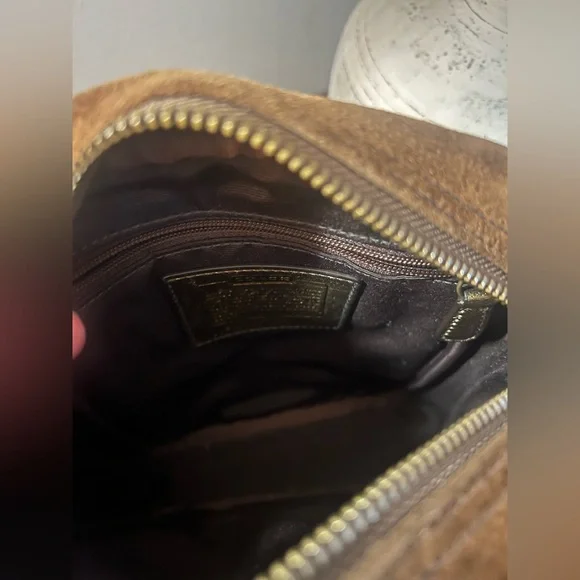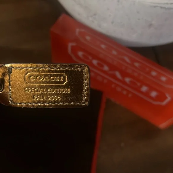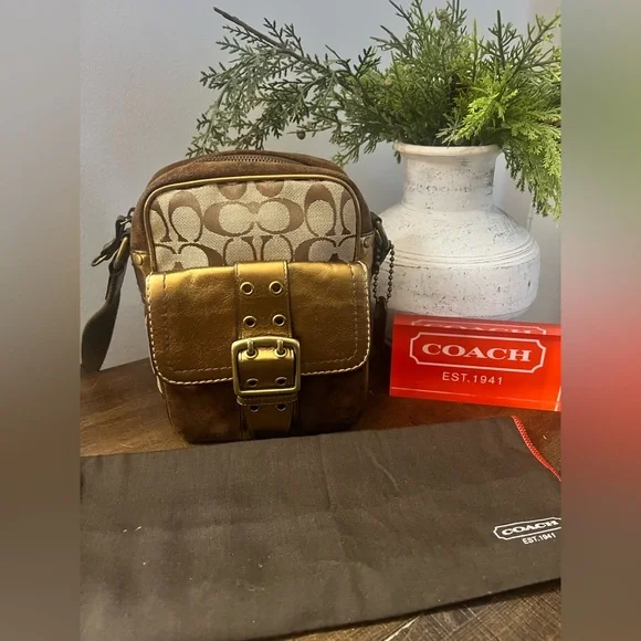 Great Preloved Condition!This Vintage Coach Crossbody bag was part of a special edition collection introduced in 2004. It is crafted in Coach’s signature canvas monogram print, suede & metallic deep gold leather. The exterior has a front pocket with a magnetic closure to carry your essentials (phone, keys, etc.), along with a slip pocket on the backside. The interior is lined in a soft brown fabric with a zippered pocket. The adjustable strap (with the leather shoulder pad) gives you the option of wearing this as a shoulder bag or crossbody bag. This is a collectible piece, for sure! Measurements: 6” (l) x 8” (h) x 3” (d)Features:• Adjustable strap• Leather Shoulder Pad• Interior & Exterior Pockets• Brass Hardware • Zip around closure (main compartment)• Magnetic closure (front pocket)• Coach hangtag (special edition)• Coach dustbag included