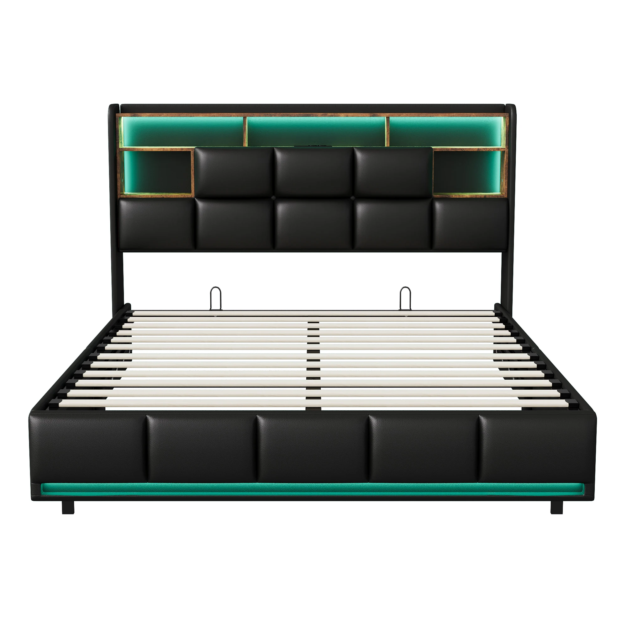 Comanlai 160x200cm Upholstered Bed with LED Lights,Headboard with Storage and USB Charging Port,Hydraulic Storage Bed,PU Leather