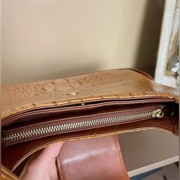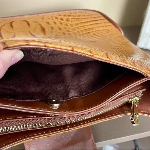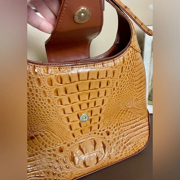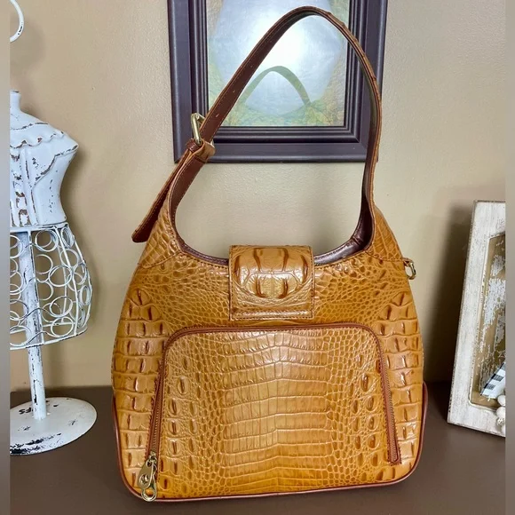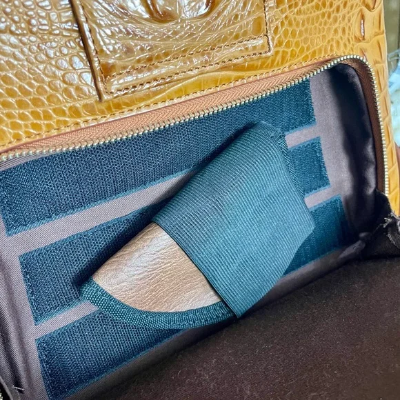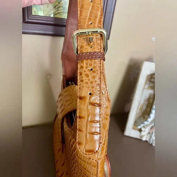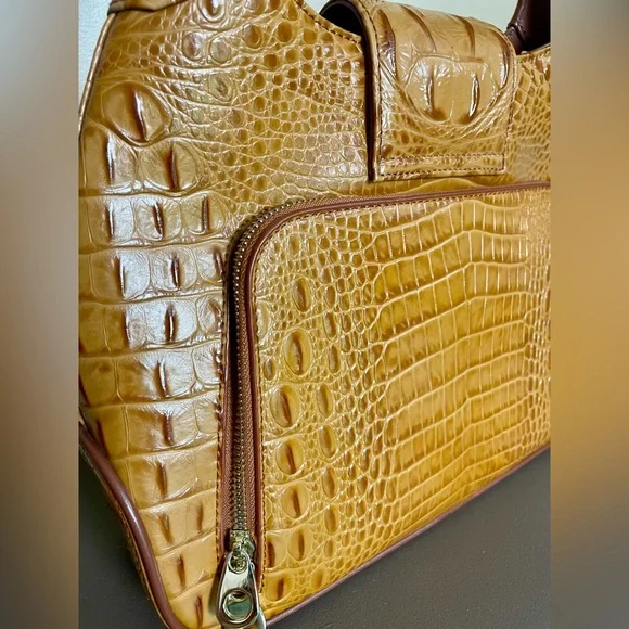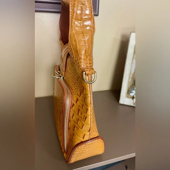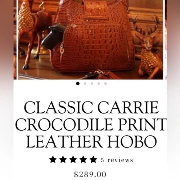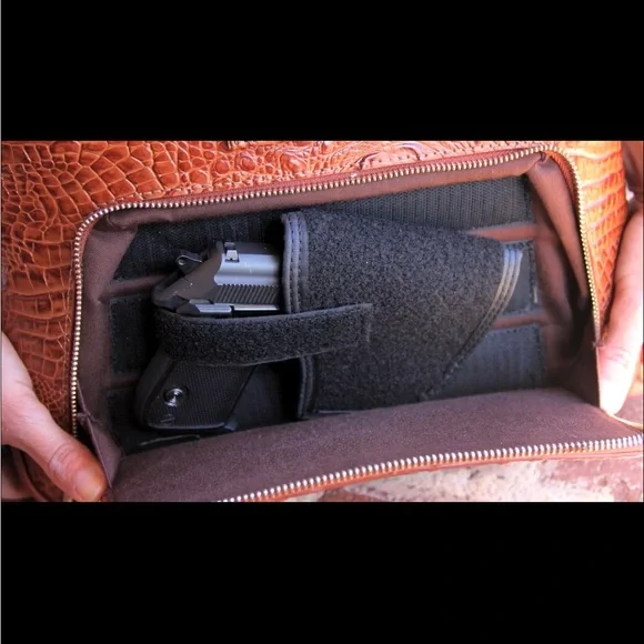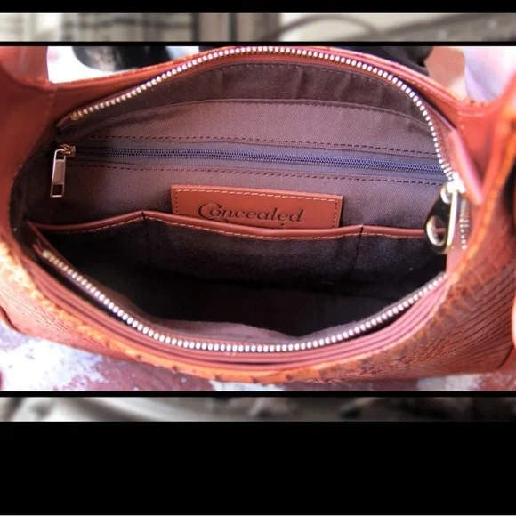 Concealed Carrie “Classic Carry”Features:*Crocodile leather.*Zip-close top with snap-close flap. *1 zippered & 3 open inside pockets.*Adjustable buckle strap. Measures:*Base is 12" wide & 4" deep. *Total height not including strap is 10” bag is 21" including strap (when set at longest buckle setting).*Outside Firearm pocket measures 8.5"wide at top & 6.5" high inside the pocket this will fit a compact or subcompact. ❤️NWOT🚫We are a Nonsmoking Home