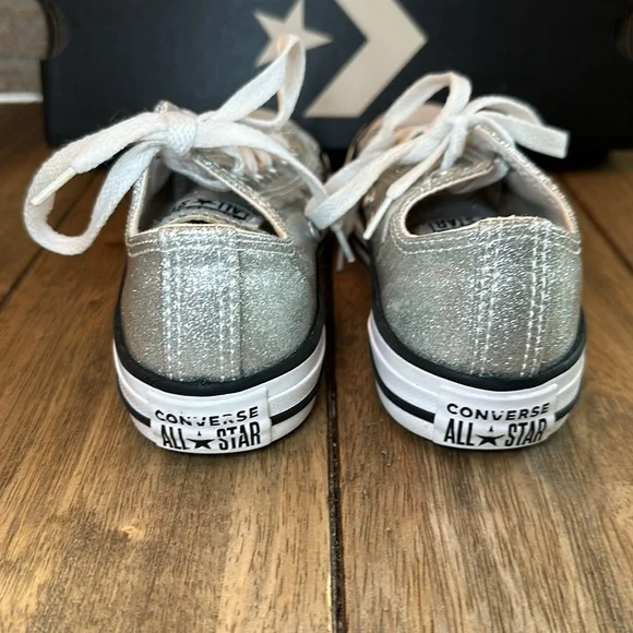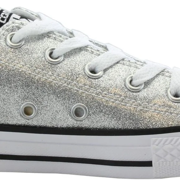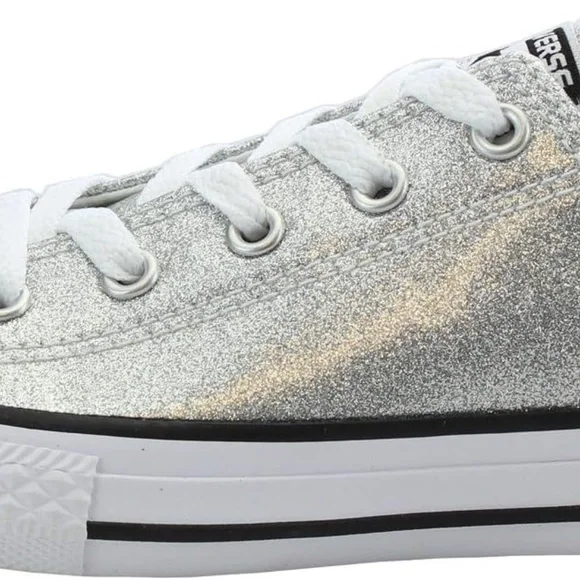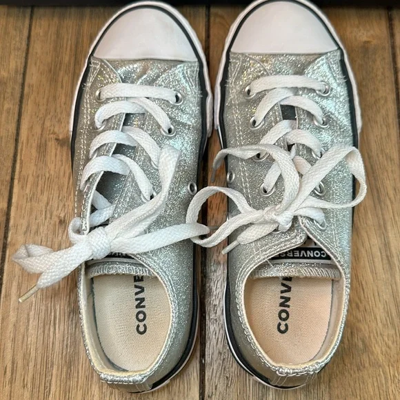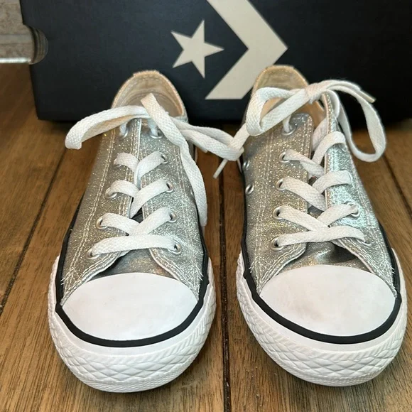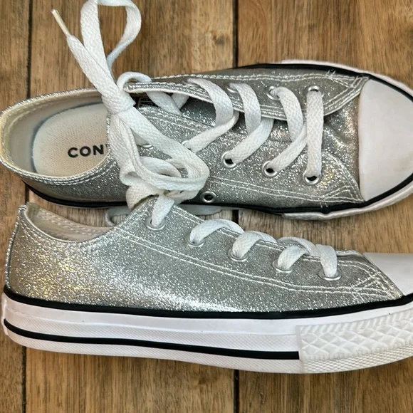 ‼️BRAND NEW WITH BOX‼️SIZE INFO:• Youth/Junior: Size 1• Converse foot length: 8" ---------------------PRODUCT DETAILS:• The silver glitter is encased in a plastic so the surface is very smooth; no loose glitter!• Signature Converse branding• Rubber toe cap & sole• Cushion insoles• White contrast stitching• Silver grommets/air holes• Lace up• Item #641727C---------------------CONDITION:• Excellent pre-owned condition• No flaws noticed during inspection• These shoes were tried on at the store, brought home, and stored in the closet!• NEVER WORN before she outgrew them. :( • Will ship with original Converse box▪️▪️▪️▪️ • All items are from a smoke-free environment.• Item shown is the exact item you will receive.• Actual colors may slightly vary based on different monitors/screens.• We ship from Conroe, Texas.** Be sure to follow us!**xx…Moody Momma & Redchucks, junior chucks, glittering, glittery, sparkly, sparkling, trendy, staple, versatile, dress up, dress down, durable, five star, trainers, youth, unisex, 1Y, school, play, vacation, every day