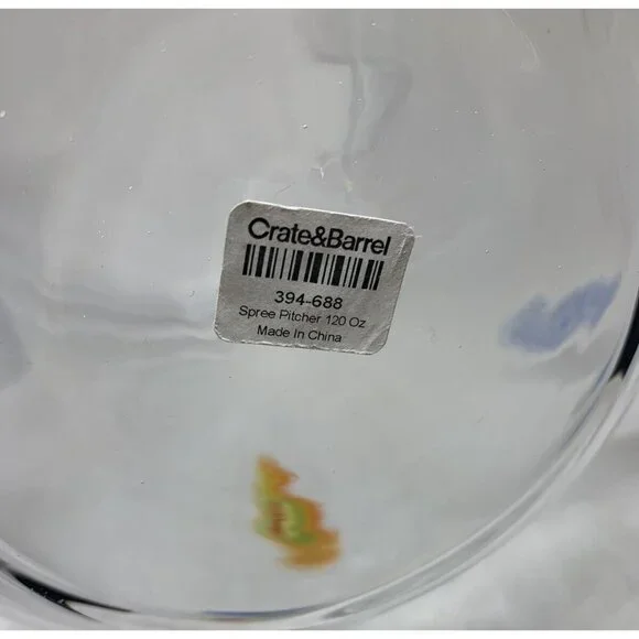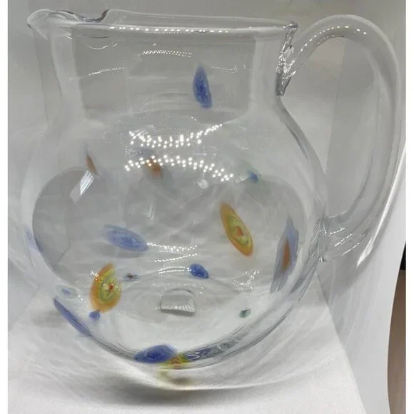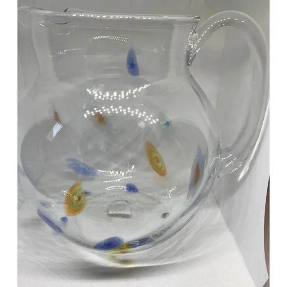 This exquisite Crate & Barrel Zazz pitcher is the perfect addition to any home. With its beautiful abstract pattern, round shape, and clear color, it is sure to fit seamlessly into any decor. The pitcher is made of high-quality glass and features the stunning millefiori technique, which adds an extra touch of elegance.Ideal for all occasions, this pitcher is great for serving margaritas, lemonade, or water. It stands at a height of 9 inches and is part of the Crate & Barrel Zazz collection. Whether you're hosting a party or just enjoying a quiet night in, this pitcher is a must-have.