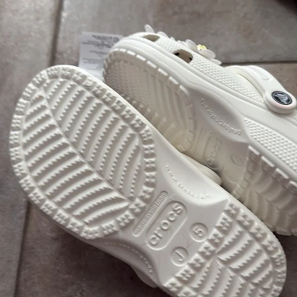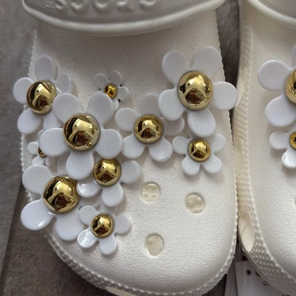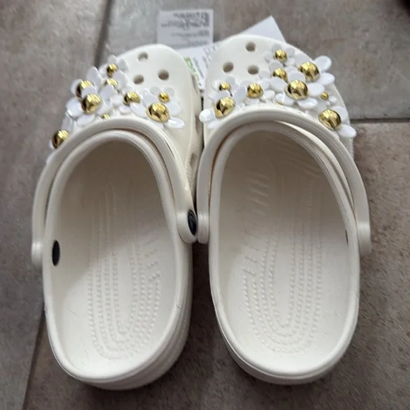 Step into style with these CROCS sandals, featuring a chic white and gold color scheme. The sandals are adorned with gold studs, adding a touch of elegance to the classic design. Perfect for both casual outings and more dressed-up occasions, these sandals offer the comfort and durability CROCS is known for.