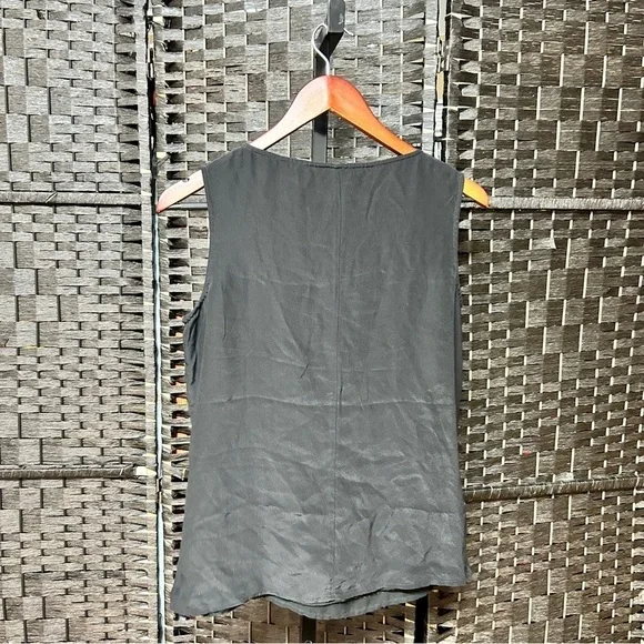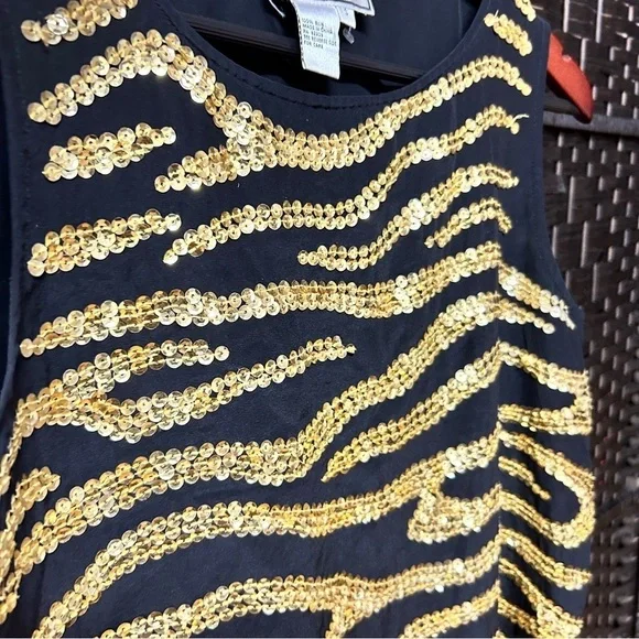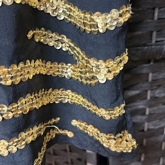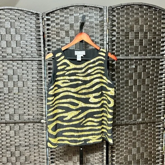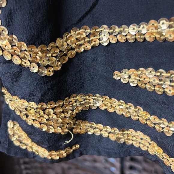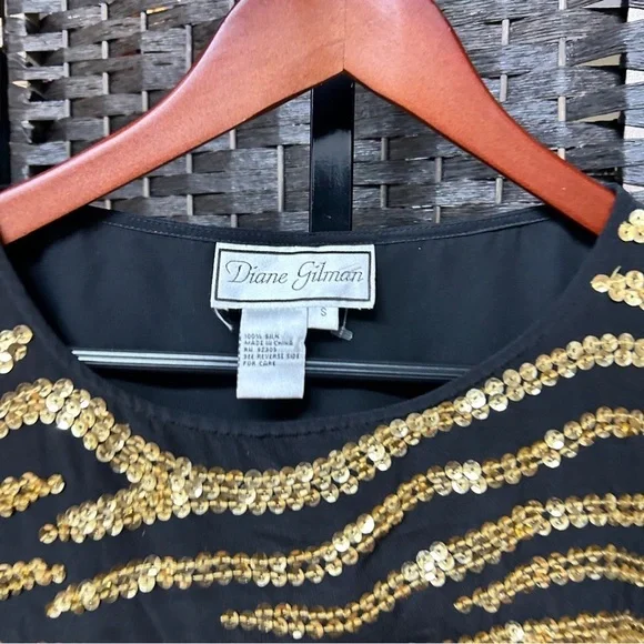 Item details:Diane Gilman silk blouse size small Sleeveless with a gold sequin pattern Lightweight with a black background A couple loose threads as pictured Boxy style Approximate measurements in inches:Length: almost 24.5Armpit to armpit: 19.5 Waist around: 30Sku: 024We’re always willing to bundle items and give discounts the more items you buy.