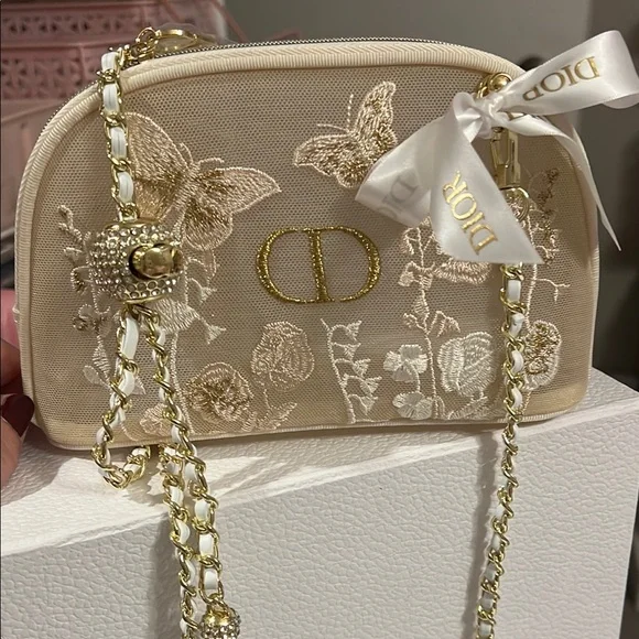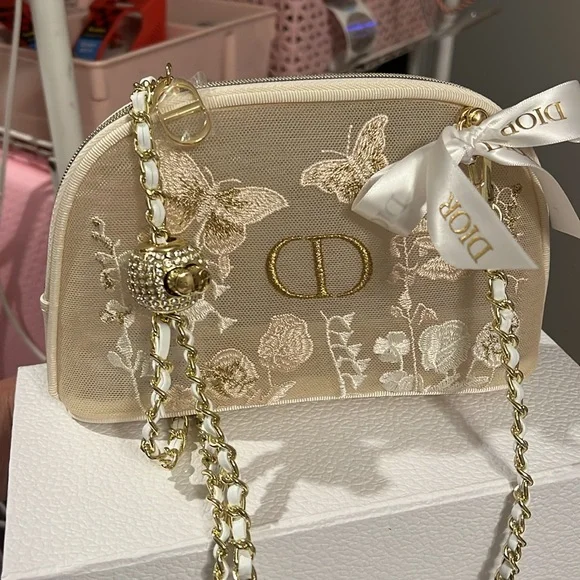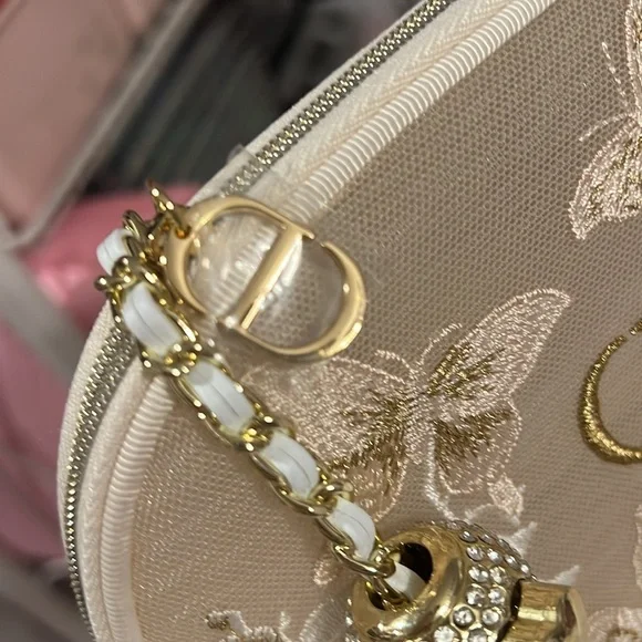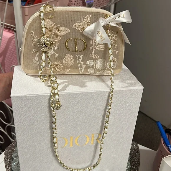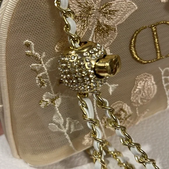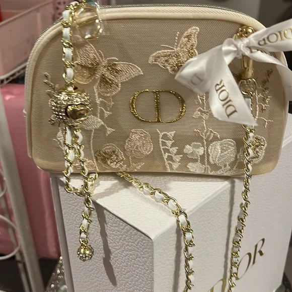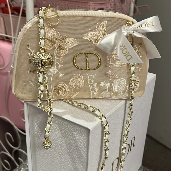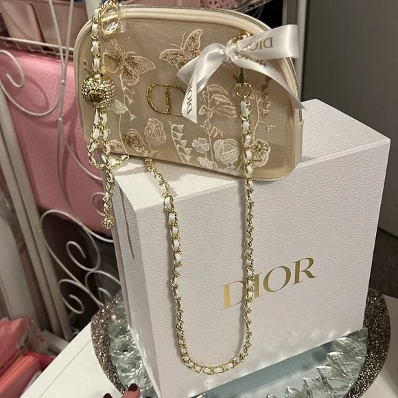 This exquisite Dior pouch showcases a luxurious cream color accented with gold butterfly embellishments, offering a blend of elegance and whimsy. The gold chain strap and prominent CD logo add a touch of sophistication, making it a versatile accessory for any occasion. Chain is 47 inch and adjustable.
