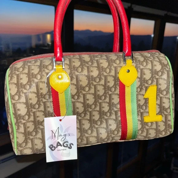 CHRISTIAN DIOR Trotter Galliano 2004 Tote Bagsuper rare!! as seen on celebrities such as Rihanna & Jisoo from Blackpink the epitome of Y2K ~ from the 2004 collection, this Christian Dior Boston bag features an all over Diorissimo Monogram print in brown with contrasting Rastafari detailing ❤️💚💛Silver-tone hardware, red leather trim, dual rolled top handles & ‘number one' appliqué at the front 1️⃣protective feet at base, maroon nylon lining, single interior zip pocket & a zip closure at top !! ✨ Condition: 7/10 - in very good vintage condition - lightly scuffed corners; minor rubs on the exterior canvas; scratches on the hardware; some fading on the trim and base; heavy darkening and small cracks on the handles; interior has a minor stain inside - (please refer to the photos & reach out with any questions you may have) ⭐️ 100% Authentic as always ⭐️ + I’m an official VERIFIED POSHMARK RESELLER ✅ 𝚇𝚘𝚡𝚘,𝓜𝓪𝓰𝓰𝓲𝓮