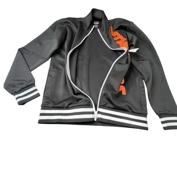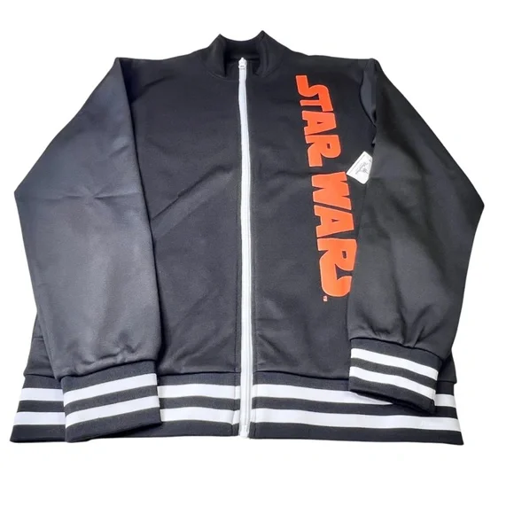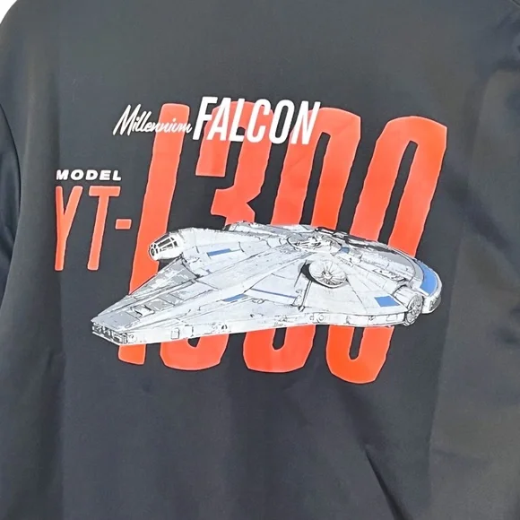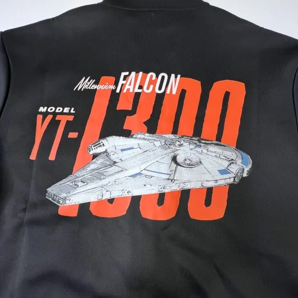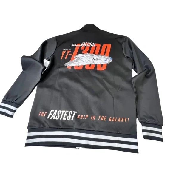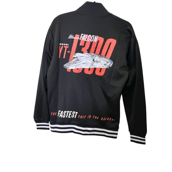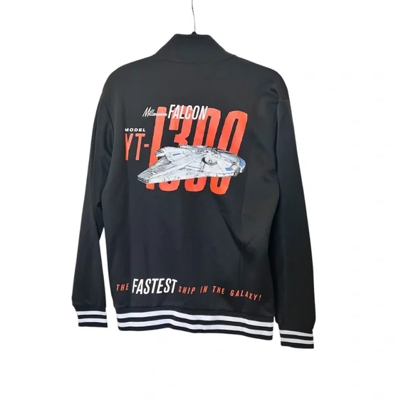This is a Disney Parks Star Wars Millennium Men's JacketIt is New With TagsIt is a black with white trim and a zip up frontThis is a beautiful Made of 95% Polyester 5% SpandexSize Small Chest 20 in. flat across armpit to arm pitLength 27 in.flat down center of back collar to hemPlease review all photos carefully.Feel free to reach out with any questions you have about the itemand also If you need any special measurements