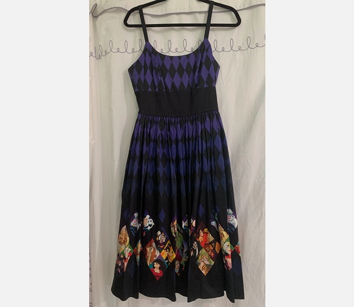 Haunt the parks in style! Authentic Disney Parks The Dress Shop fit-and-flare sundress featuring a purple/black harlequin (argyle) bodice and a full skirt with an all-over Disney Villains border print (Ursula, Evil Queen, Maleficent, Cruella, Hades, Jafar, Mother Gothel, Queen of Hearts, Scar, etc.).