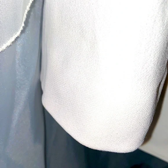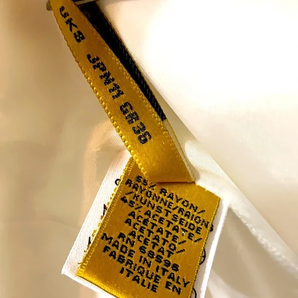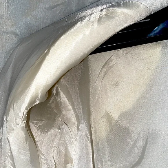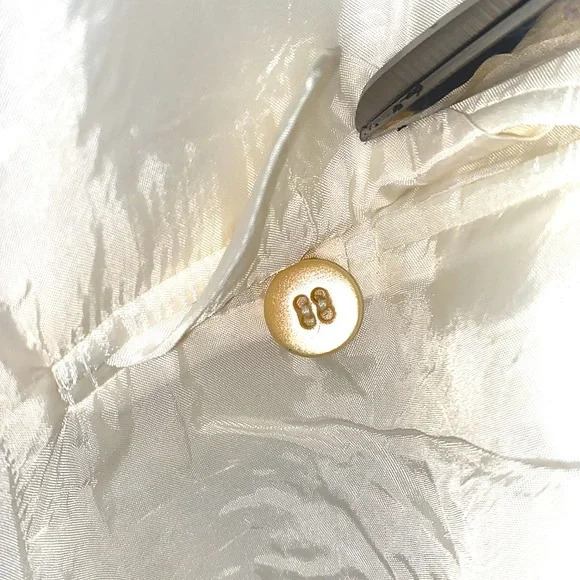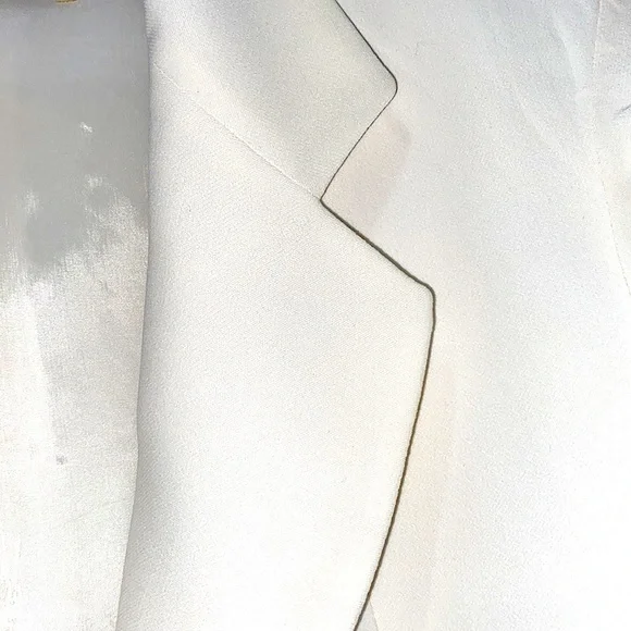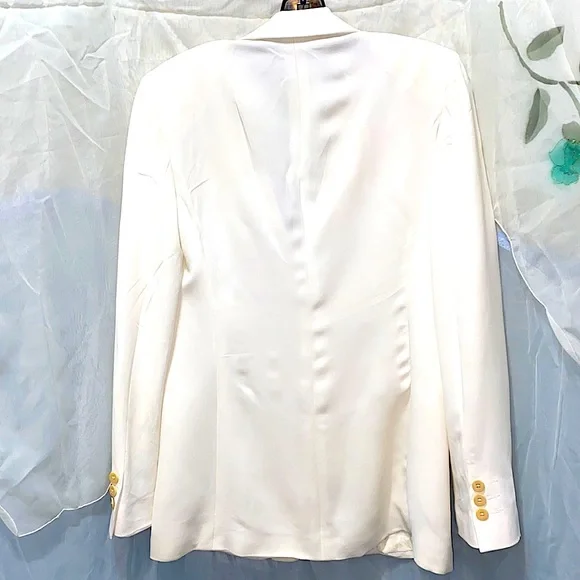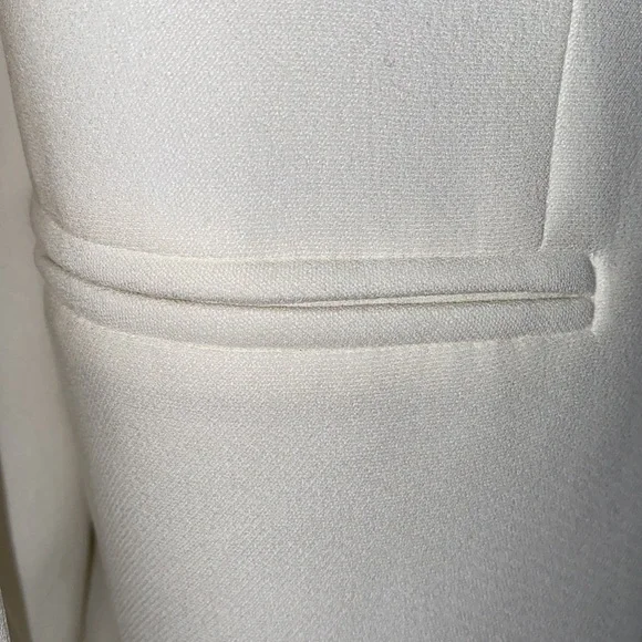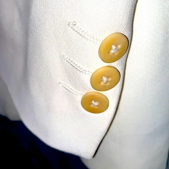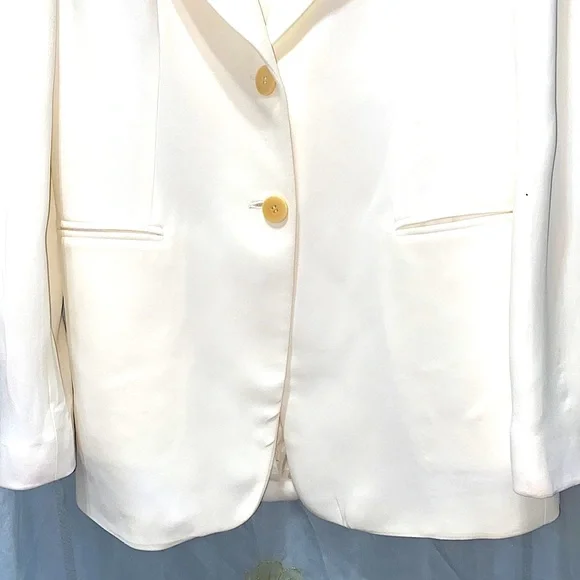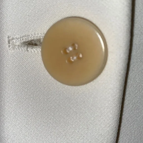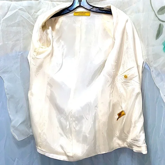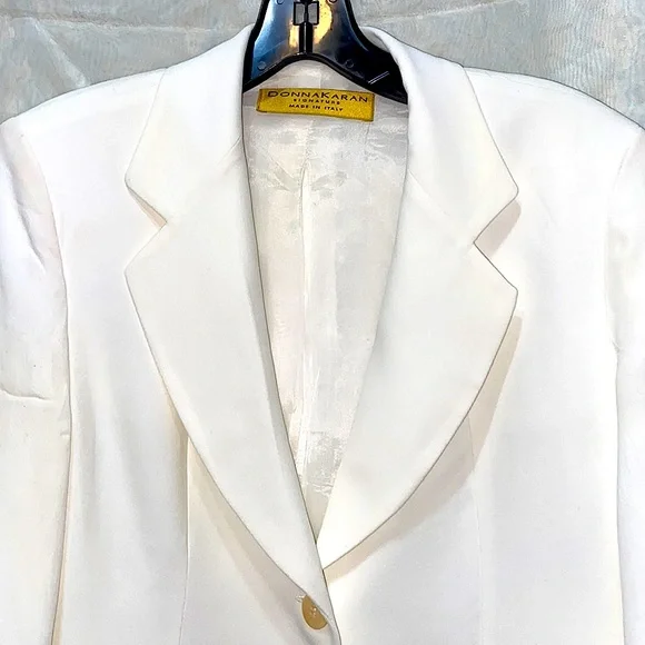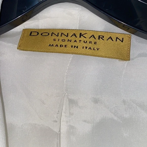 DONNA KARAN SIGNATURE WHITE BLAZER SZ 6, MADE IN ITALY, previously owned, lined, 2-button single breasted, beige shoulder pads & buttons, welt pockets, 3-button cuffs w/buttonholes & vents, lapels, collar, darts, ARMPIT TO ARMPIT: 18 3/8”, ARMPIT TO HEM: 18 5/8”, LGTH: 29”, WAIST: 34”, SLV LGTH: 24 5/8”,