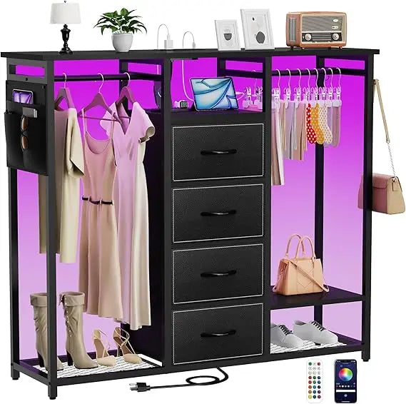 Dresser for Bedroom with 2 Clothes Racks, 4 Drawer Closet with Led Light and Charging Station, Black Wardrobe with Hanging Rack,