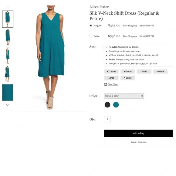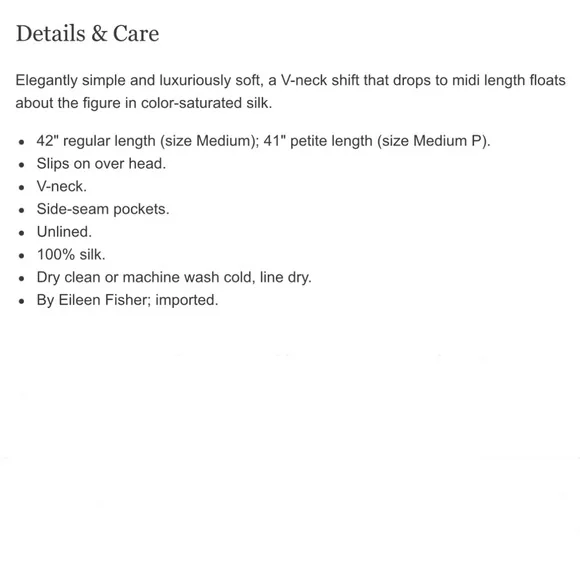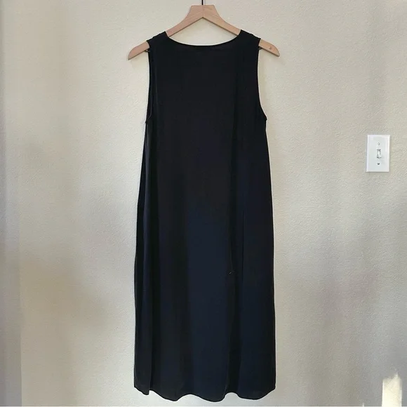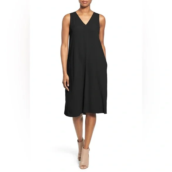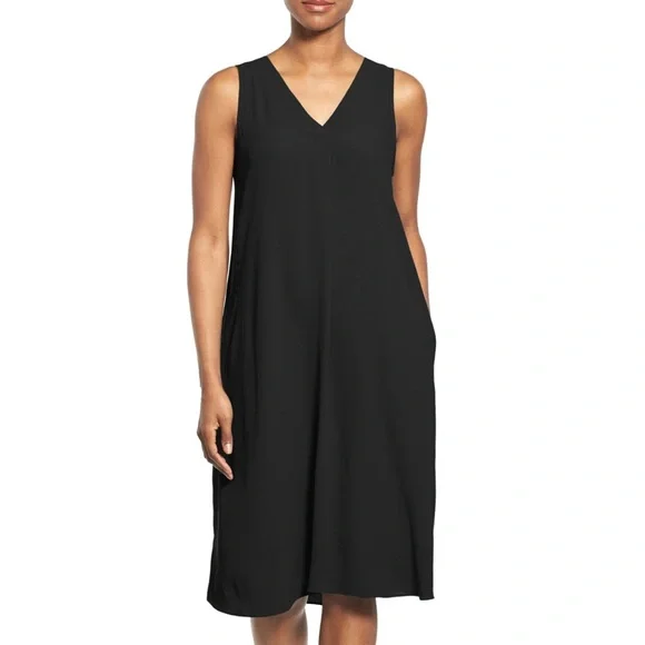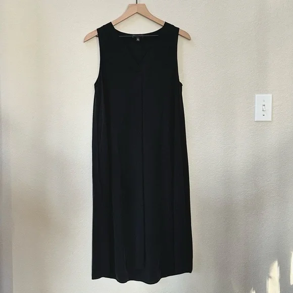 Gorgeous dress from Eileen Fisher, size S. 100% silk georgette crepe fabric, slight chiffon feel, pleated v-neck neckline with wide band trim, seam pockets. Knee length. Comfortable and lightweight — perfect for summer! Only very light wear/fade. Overall excellent condition!approx measurements: 42” long • 19” pit to pit ♡ style / keywords: quiet luxury • luxe • career • teacher • neutral • silky • sleeveless♡ care: machine wash or dry clean ♡ more info: Style S6GC-D3149please check my other listings and bundle your favorites for a discount! ♡pro seller for 17+ years • same or next day shipping • please use photos as part of description • positive feedback appreciated, constructive criticism welcomed!