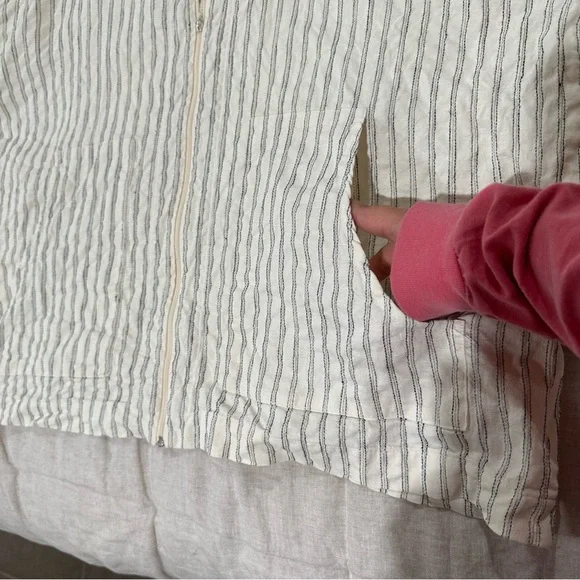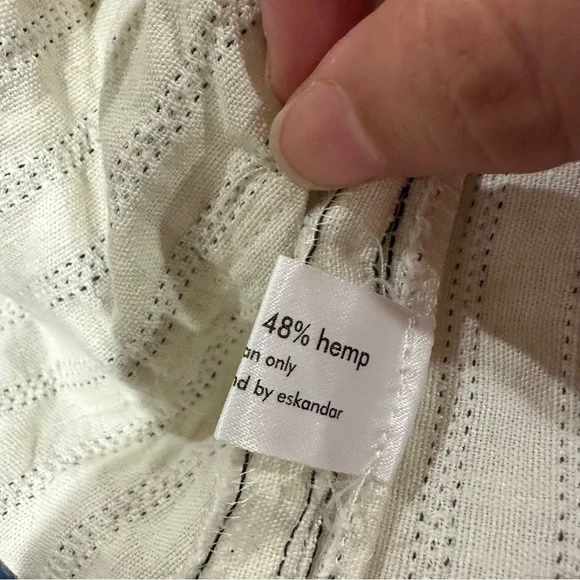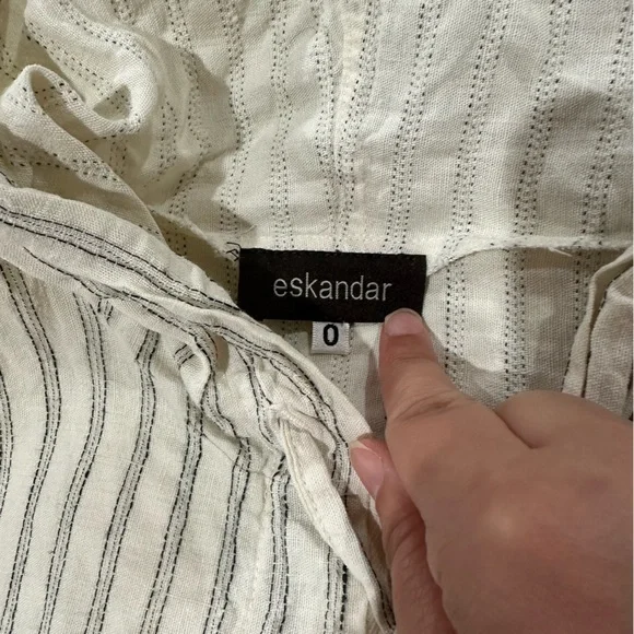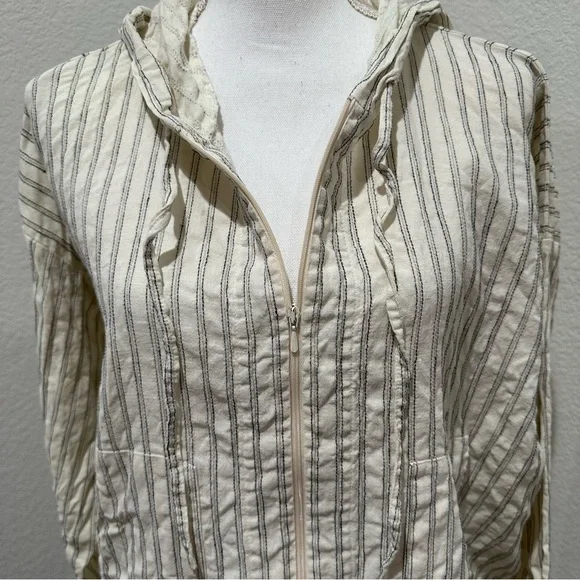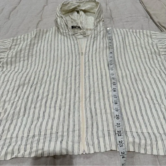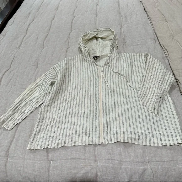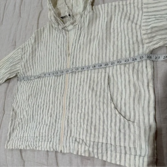 Eskandar hooded boxy zip up jacket with front pockets52% Linen 48% HempMade in EnglandColor - Off White / Ivory / Cream with black stripesFront full zipper closurefront patch pocketsHood with drawstringsLong sleevesSize 0Measurements shown in photos Great preowned condition Ask any questions Lagenlook neutral natural fibers sustainable closet basic capsule wardrobe elevated basic Size Small oversized relaxed fit