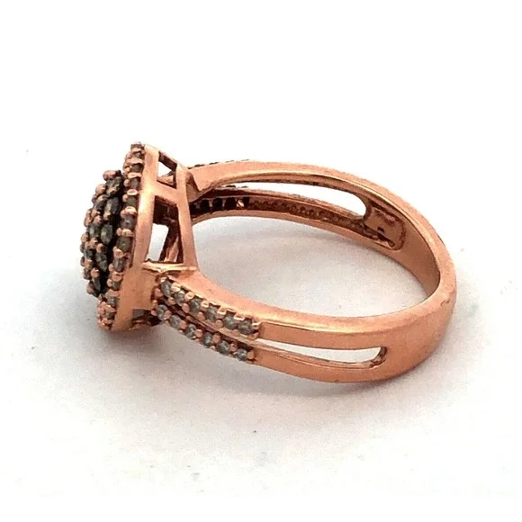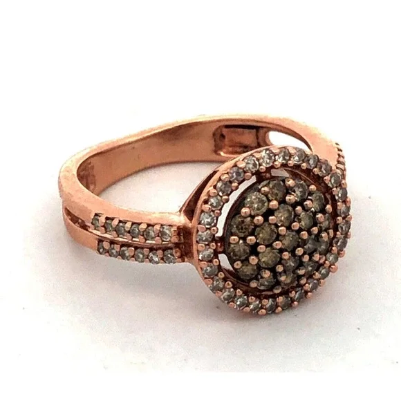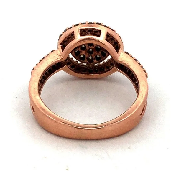* Estate 14K Rose Gold Round Chocolate Diamond Pave Cluster Halo Cocktail Ring* Ring size: 5 * Band width: 2.5 mm * Top of ring measures: 7/16"* Weight: 3.2 tgw * 19 Round Chocolate Diamonds measure approximately 1.4 mm each* 51 Round White Diamonds measure approximately 1 mm each * Ring can be resized for an additional fee. * Unmarked. * Professionally assayed. * Condition: As pictured.* G4876