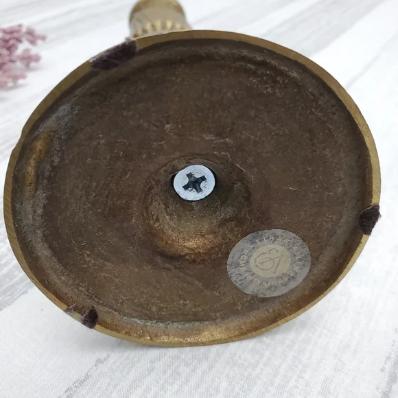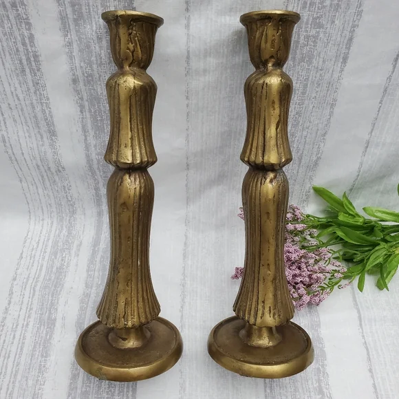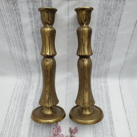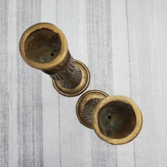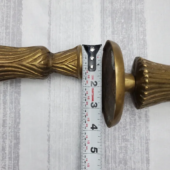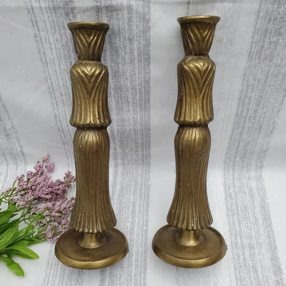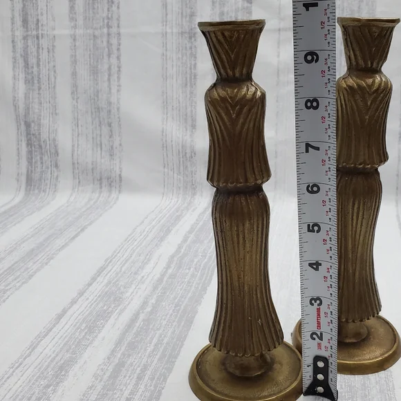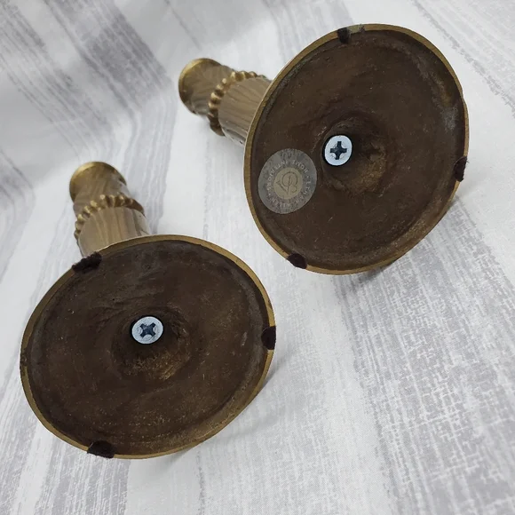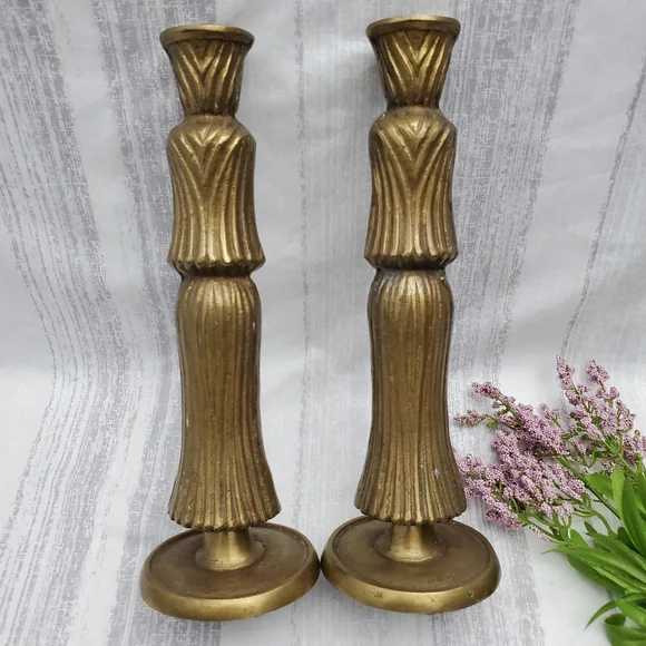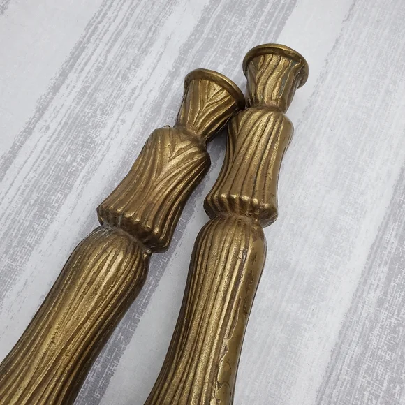 Ethan Allen Brass Tassel Taper Candlesticks Candle Holders This listing is for the PAIR of ETHAN ALLEN metal candlesticks-taper candle holders.Each one is heavy.Solid brass with an antique finish making them appear bronze.They are cast in the style of tassels.These would look great to dress up any room.They could sit on a mantel, cocktail, entry, or dining table.MCM. Mid Century Modern.Each one measures:3-3/8" wide across base x 9-3/4" tall.Excellent Condition.