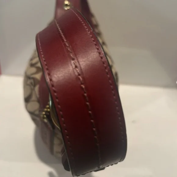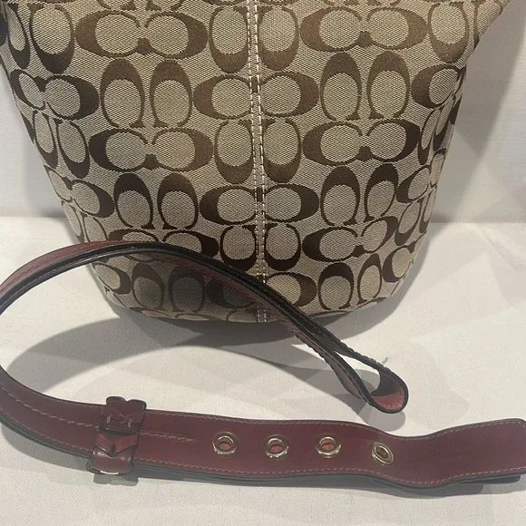 EUC Coach Khaki/Burgundy Signature Bleeker Bucket Bag convertible crossbody. Beautiful Coach Leather Hangtag with Horse & Carriage. Leather Zipper pull. Inside has a zipper pocket with two Slip pockets.Canvas and Leather on this bag is in excellent used condition. Clean inside and outside. Registration Creed is J0769Dimensions: H11”x W13.5”x D5”