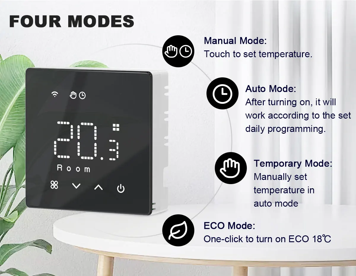 【Three Working Modes】:  Auto mode, Manual mode, Programmable temporary mode.