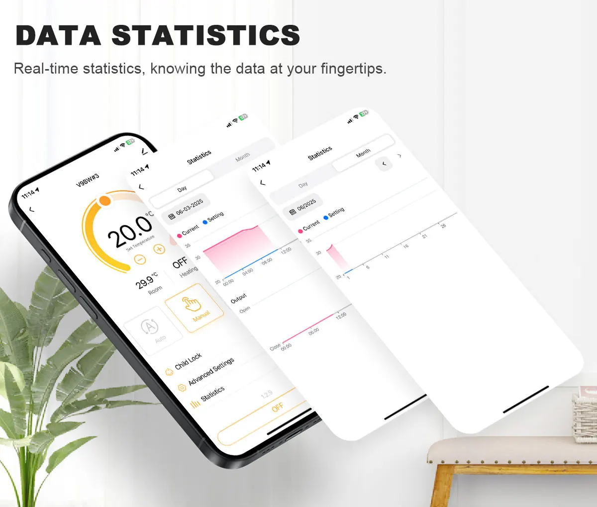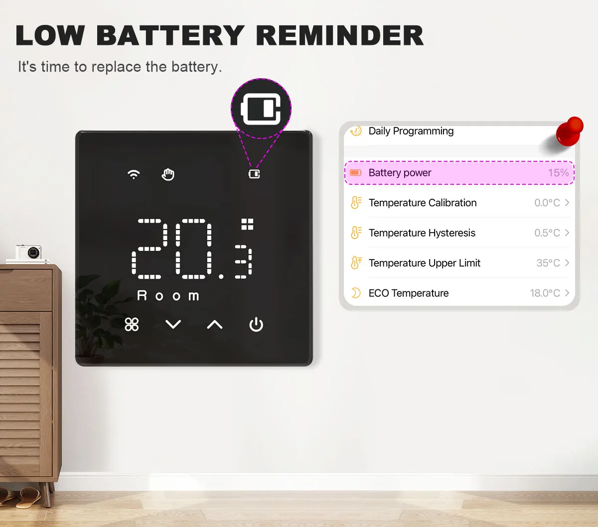 When the battery power is less than 20%, the thermostat and APP will prompt, warning in advance, leaving enough time to replace the battery