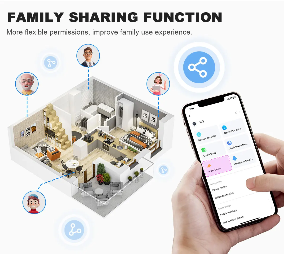 You can share the device with your family and friends in the APP and enjoy smart life together.