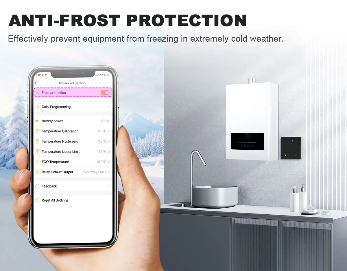 Once the room temperature is detected to be below 5℃, the thermostat will automatically start heating to 7℃, effectively preventing the device from freezing.