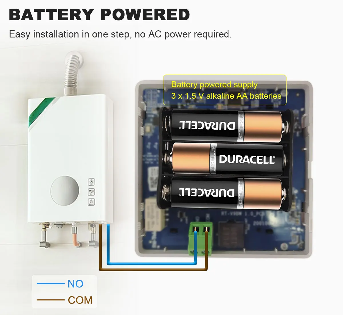 Battery version is a wireless thermostat compatible with dry contact signal control boilers. It only needs 3 AAA batteries for power supply and is suitable for scenarios where AC power cannot be used.