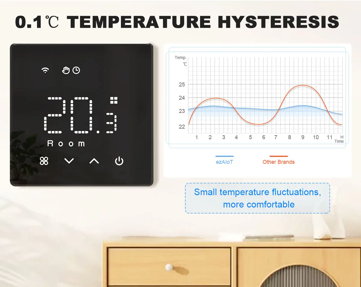 The factory default is 0.5℃, which can be set to 0.1℃, with smaller temperature fluctuations and improved comfort.