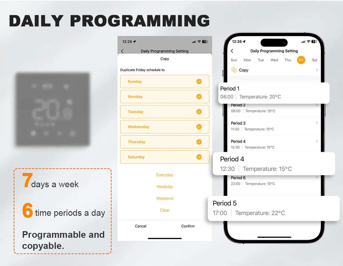 Weekly Schedule Function】:Automatically or manually set the weekly temperature for 6+1, 5+2 and 7 days in 6 time period per day to create a schedule that fits your lifestyle.